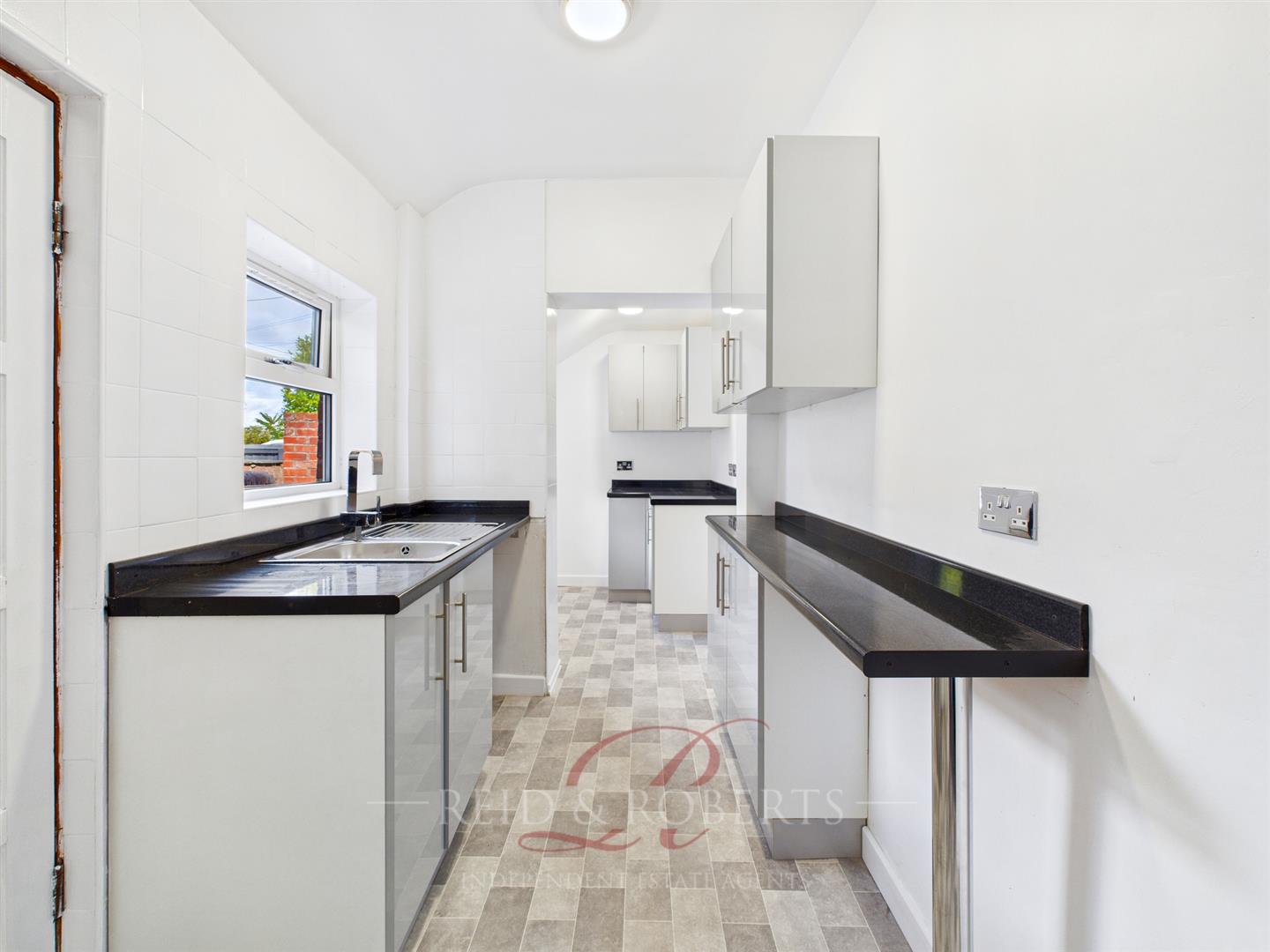 Housing a range of grey high-gloss wall and base units with complementary worktop surfaces, stainless steel sink unit with mixer tap, two UPVC double glazed windows to the side elevation, part tiled walls, vinyl flooring, space for cooker, void and plumbing for washing machine. Door leading to the rear.