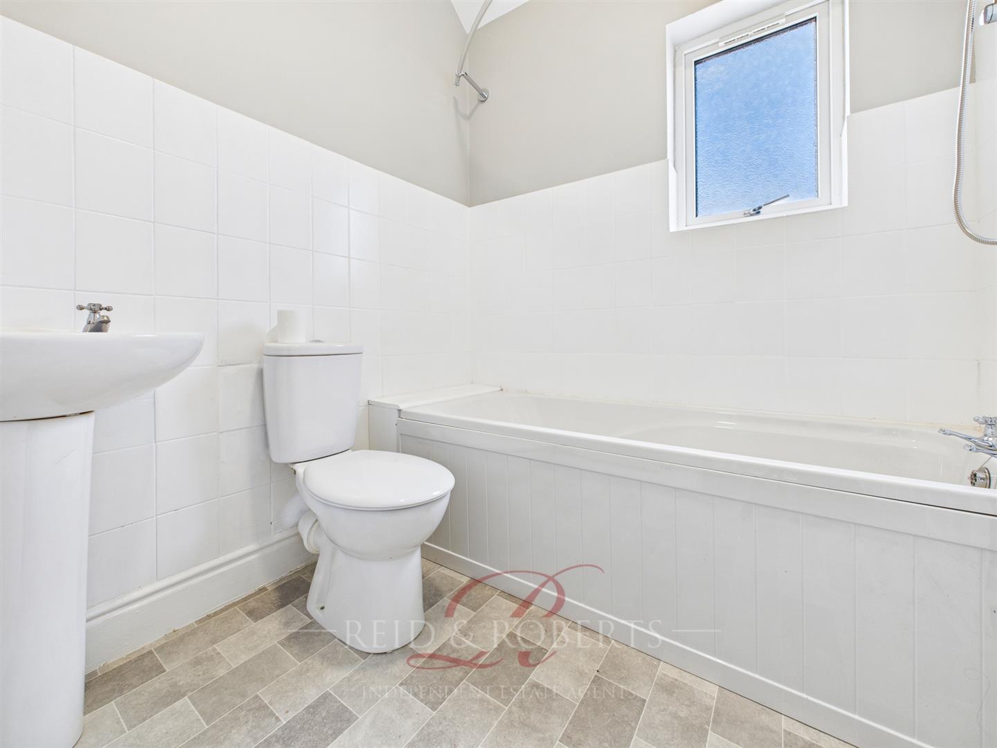 Fitted with a three-piece suite comprising panelled bath with Triton electric shower over, wash hand basin, low-level WC, part tiled walls, vinyl flooring, UPVC frosted window to the rear elevation.