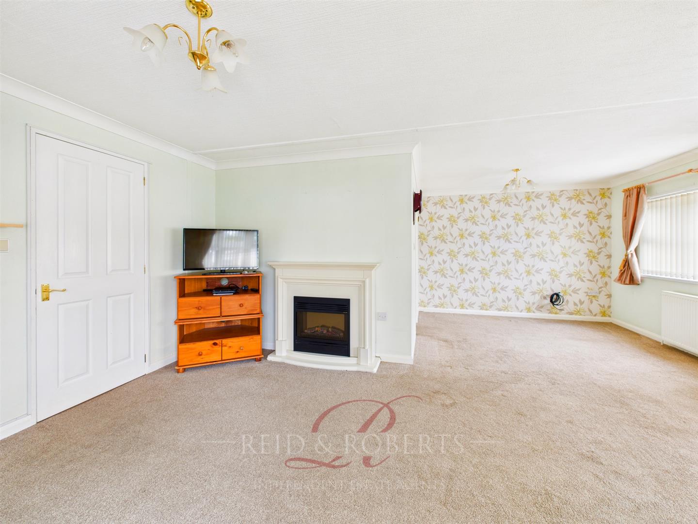 A bright and welcoming reception space with three UPVC double glazed windows to the front and side elevation, allowing for plenty of natural light. Featuring a log-effect electric fire with surround, two panelled radiators, carpeted flooring, ceiling light point, and both telephone and television points.