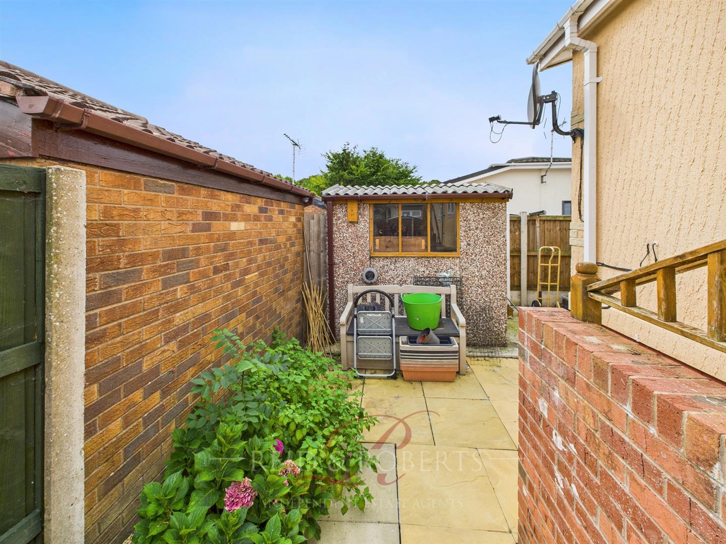 The rear garden offers a low-maintenance outdoor space with paved seating area, established flower beds, and fencing to boundaries. Added benefits include an outside tap, solar-powered water fountain, and a shed fitted with electric supply.