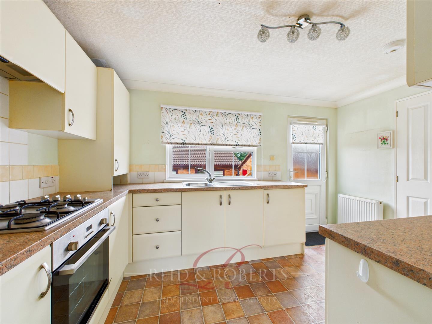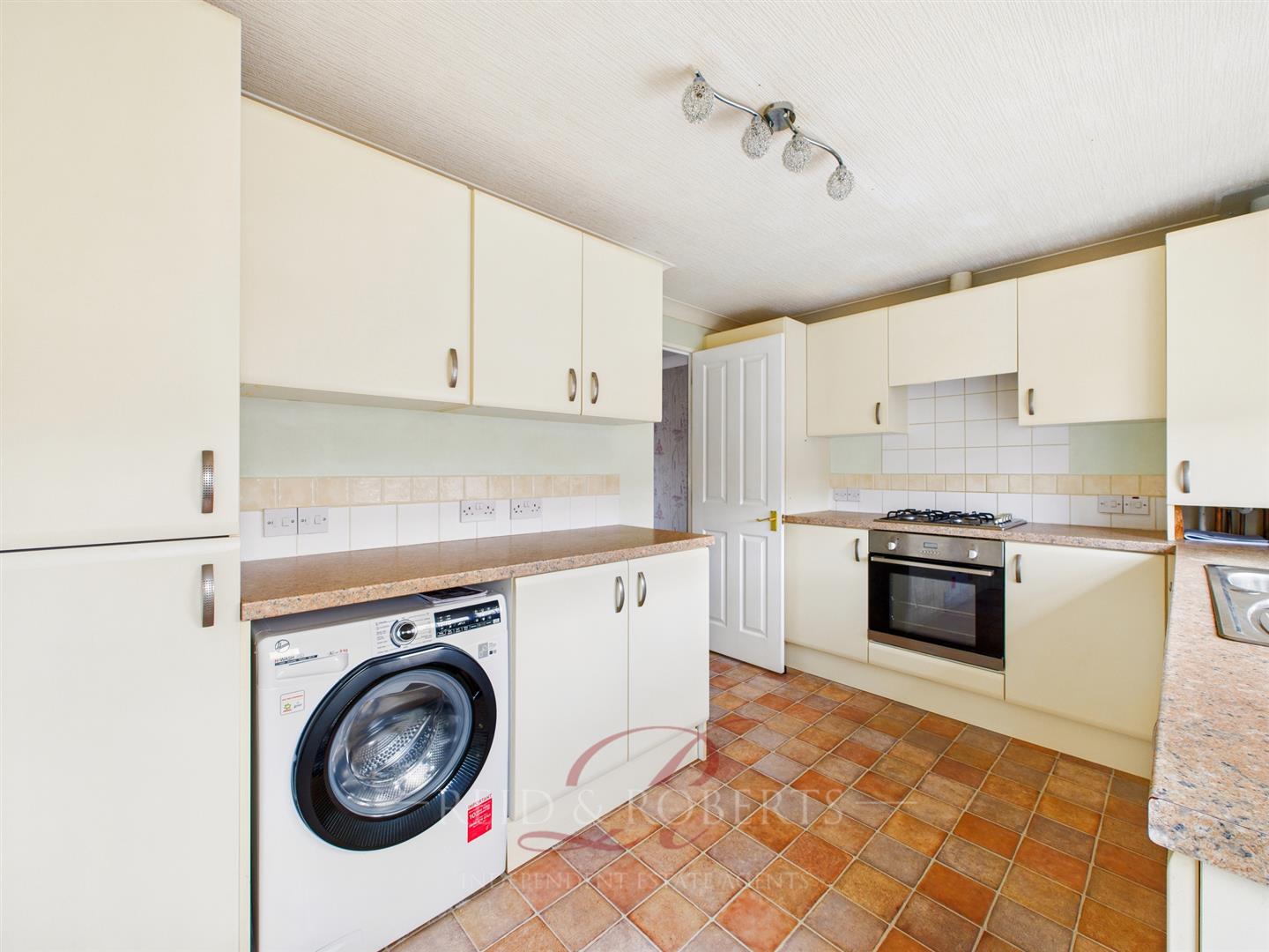 Fitted with a modern range of wall, base, and drawer units complemented by worktop surfaces. Incorporating a Lamona electric oven with four-ring gas hob and extractor fan above, integrated fridge/freezer, stainless steel sink unit with mixer tap, and space with plumbing for a washing machine. Cupboard housing the wall-mounted Worcester combination boiler.
