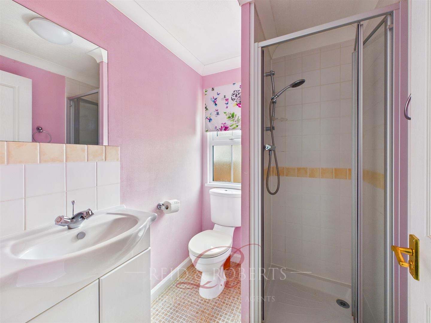 Fitted with a low-level WC, wash hand basin set within vanity unit, and shower enclosure. Finished with vinyl flooring, radiator, and frosted UPVC double glazed window to the side elevation.