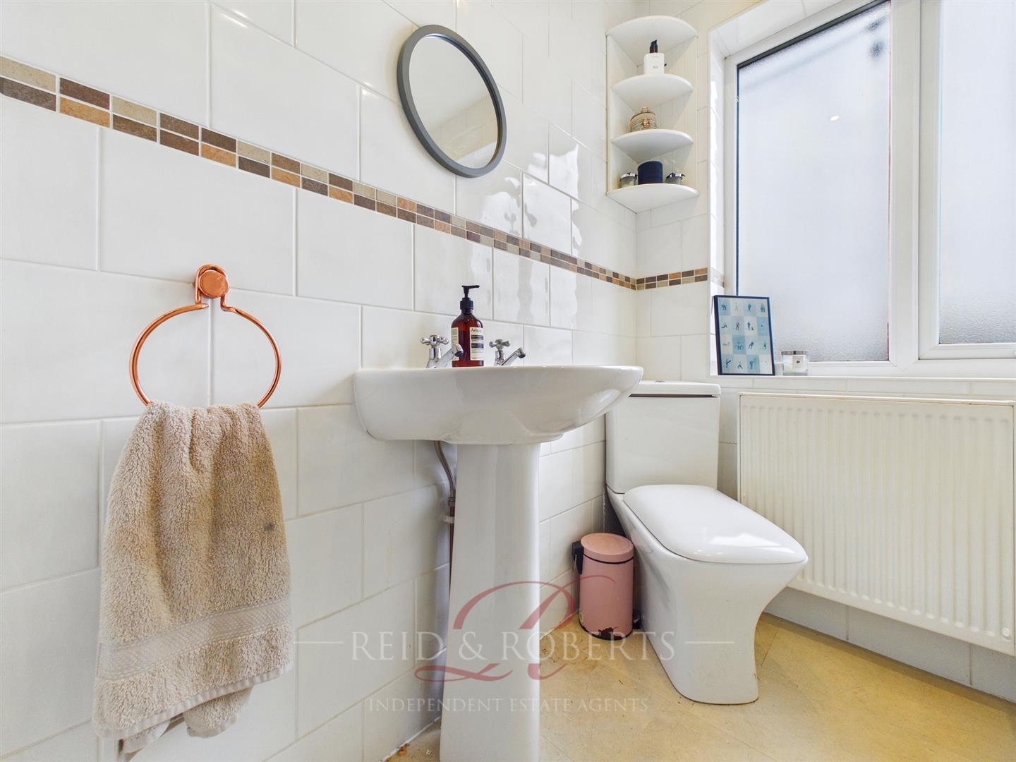 A bright three-piece suite comprising a pedestal sink with taps, corner W.C and a panelled bath with a wall-mounted mains powered shower with an adjustable headset over and shower screen. Fully-tiled walls and vinyl flooring maintain easy cleaning, whilst a UPVC double-glazed frosted window to the rear elevation ensures natural light and privacy. Finishes of the space include spotlights and a panelled radiator.