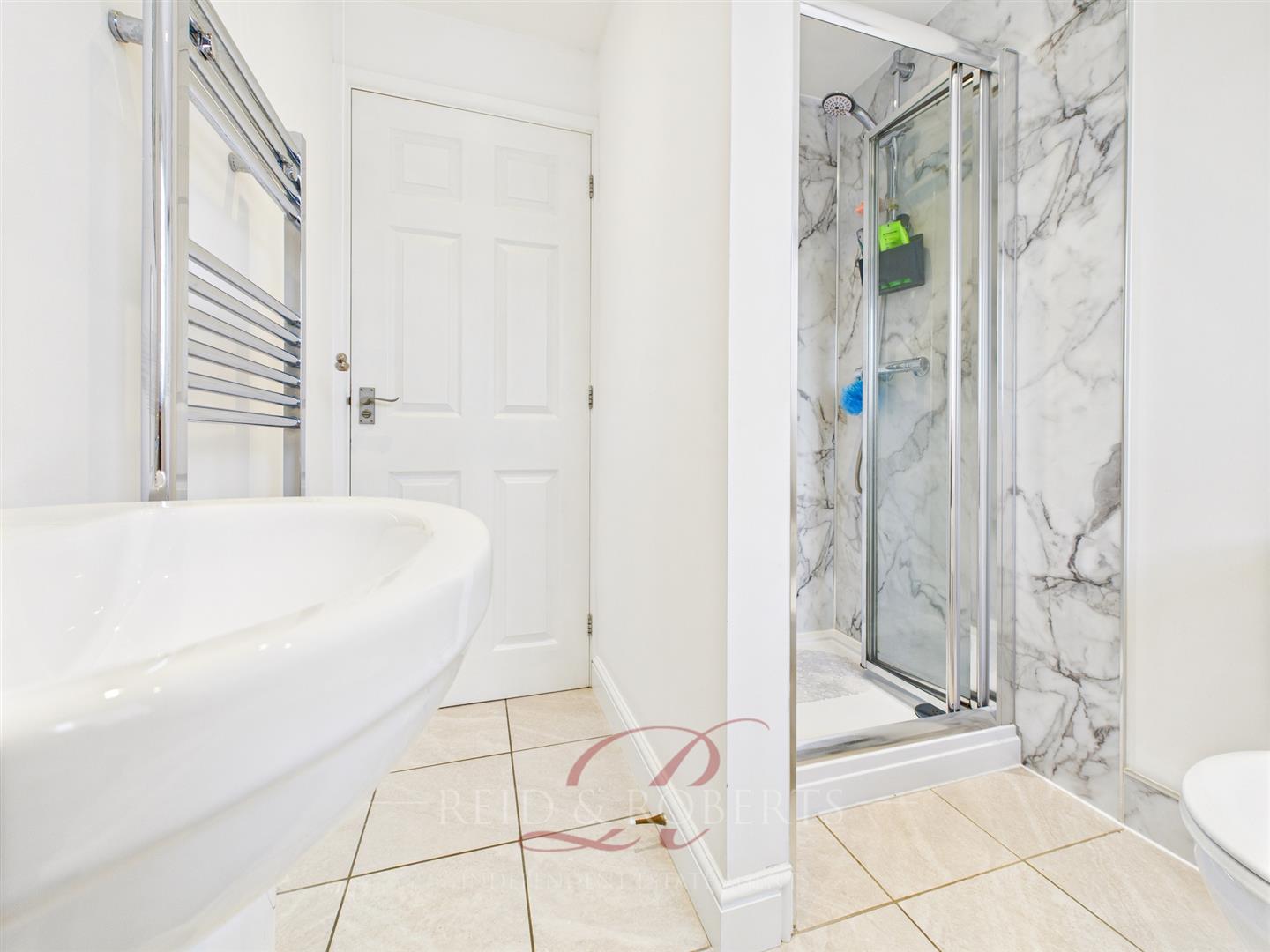A beautifully appointed four piece suite comprising walk in shower cubicle, panelled bath, low level W.C, and wash hand basin with mixer tap. Complemented by tiled flooring, heated towel rail, inset spotlights, and a UPVC double glazed window to the rear.