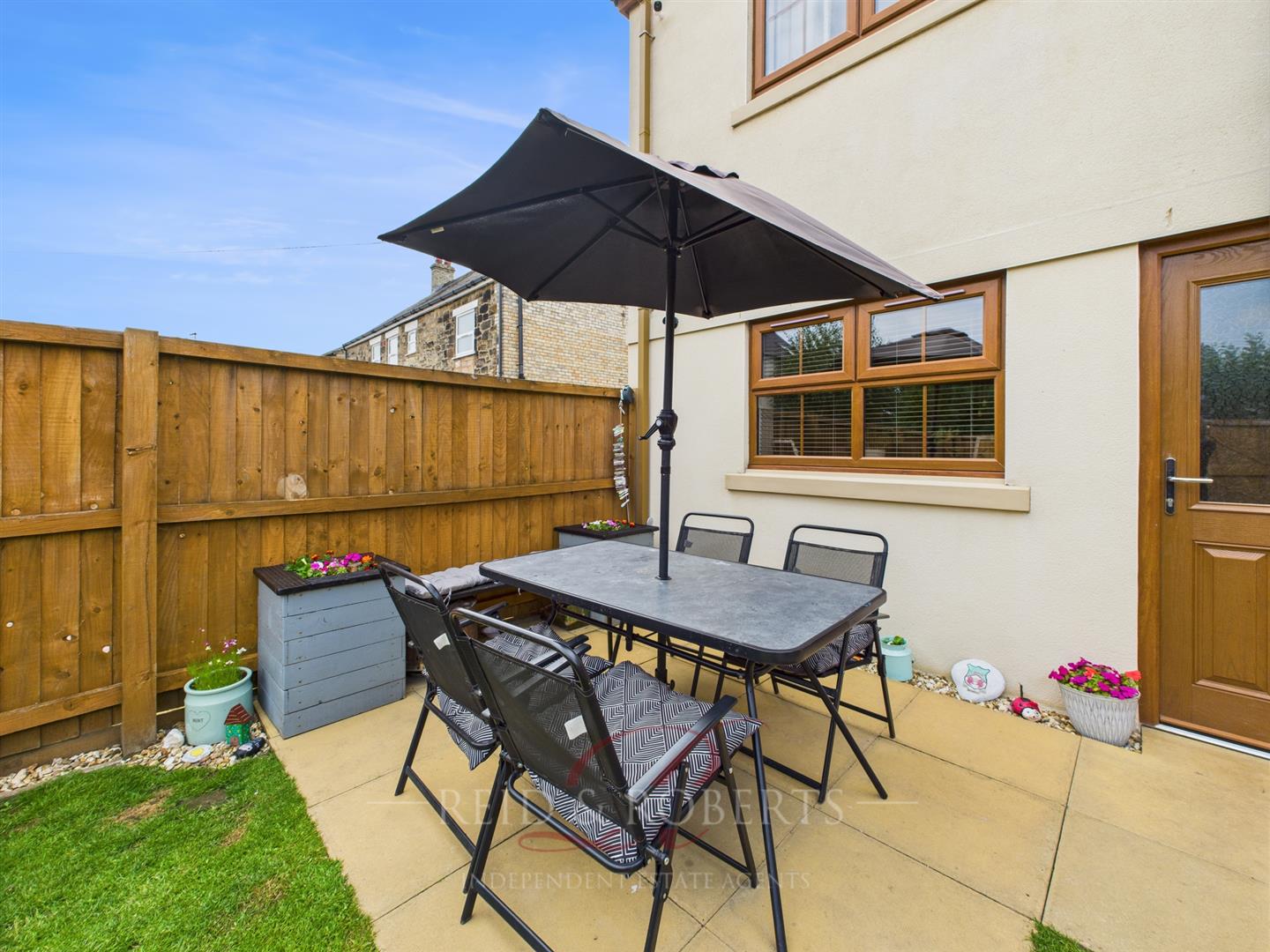 To the front, the property features gated access leading to a low-maintenance garden. At the rear, there are three allocated parking spaces, with the garden accessed through a secure gate. The rear garden is fully enclosed with panel fencing and offers a well-kept lawn along with a paved patio seating area, perfect for outdoor relaxation.