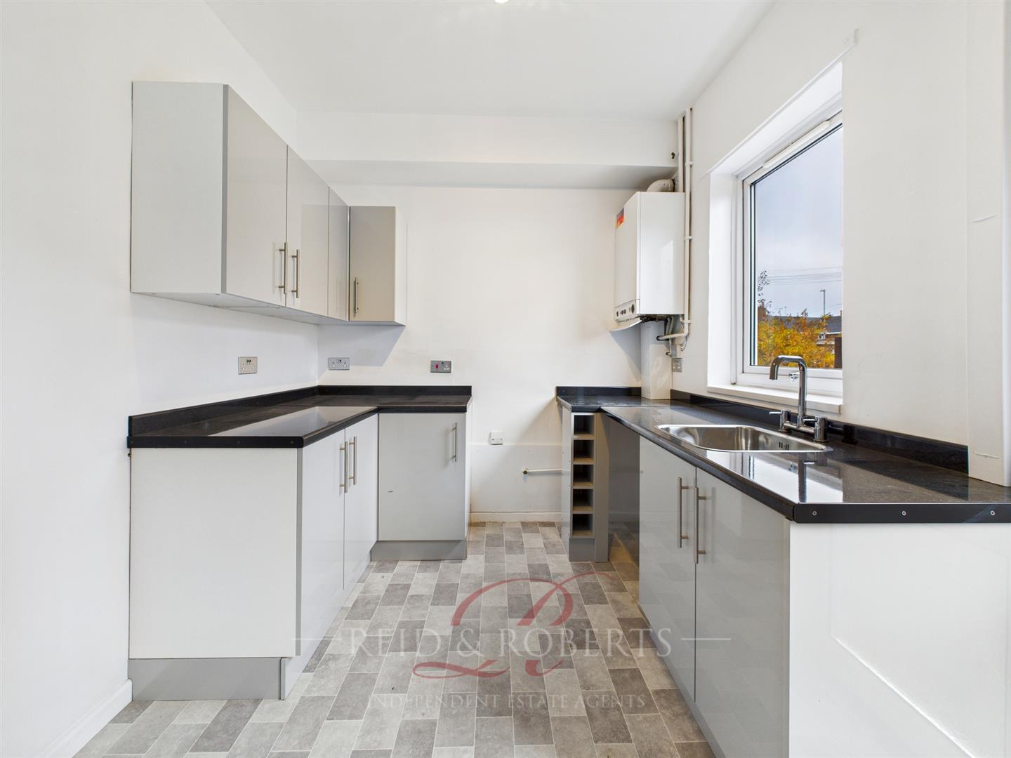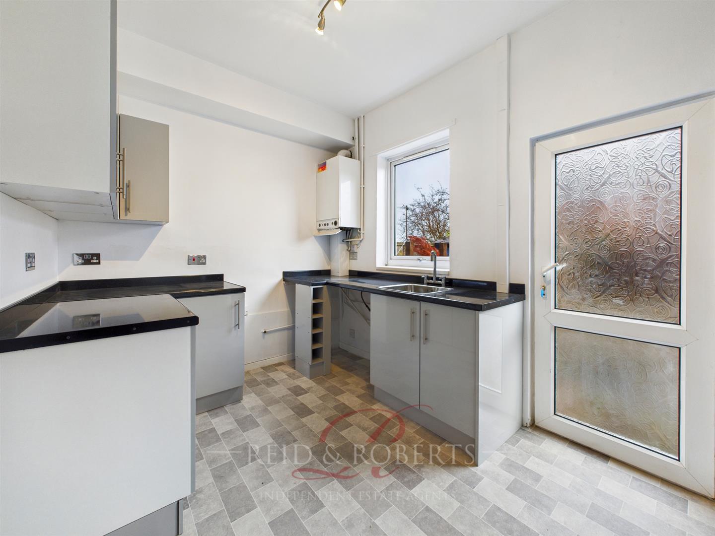 Fitted with a range of wall and base units with complementary worktop surfaces over. Stainless steel sink unit with mixer tap above. Space for cooker, washing machine, and wine rack. Housing wall-mounted ‘Main’ Combi Boiler. Useful understairs storage cupboard. Finished with vinyl flooring, single panelled radiator, and ceiling light point. UPVC double glazed window to the rear elevation and UPVC door leading out to the rear garden. Stairs rising to the first floor accommodation.