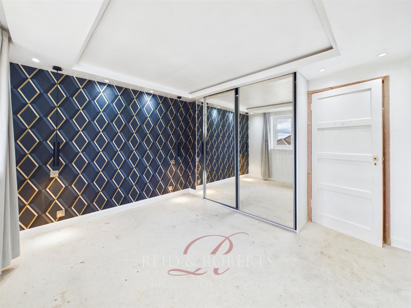 A generously sized principal bedroom, thoughtfully designed with decorative ceilings featuring integrated spotlights and striking hanging feature lights. Mirrored sliding wardrobes with hanging rails provide ample storage, while carpeted flooring adds comfort and warmth. UPVC double-glazed windows to the front elevation flood the room with natural light, complemented by a modern vertical panel radiator and additional built-in storage.