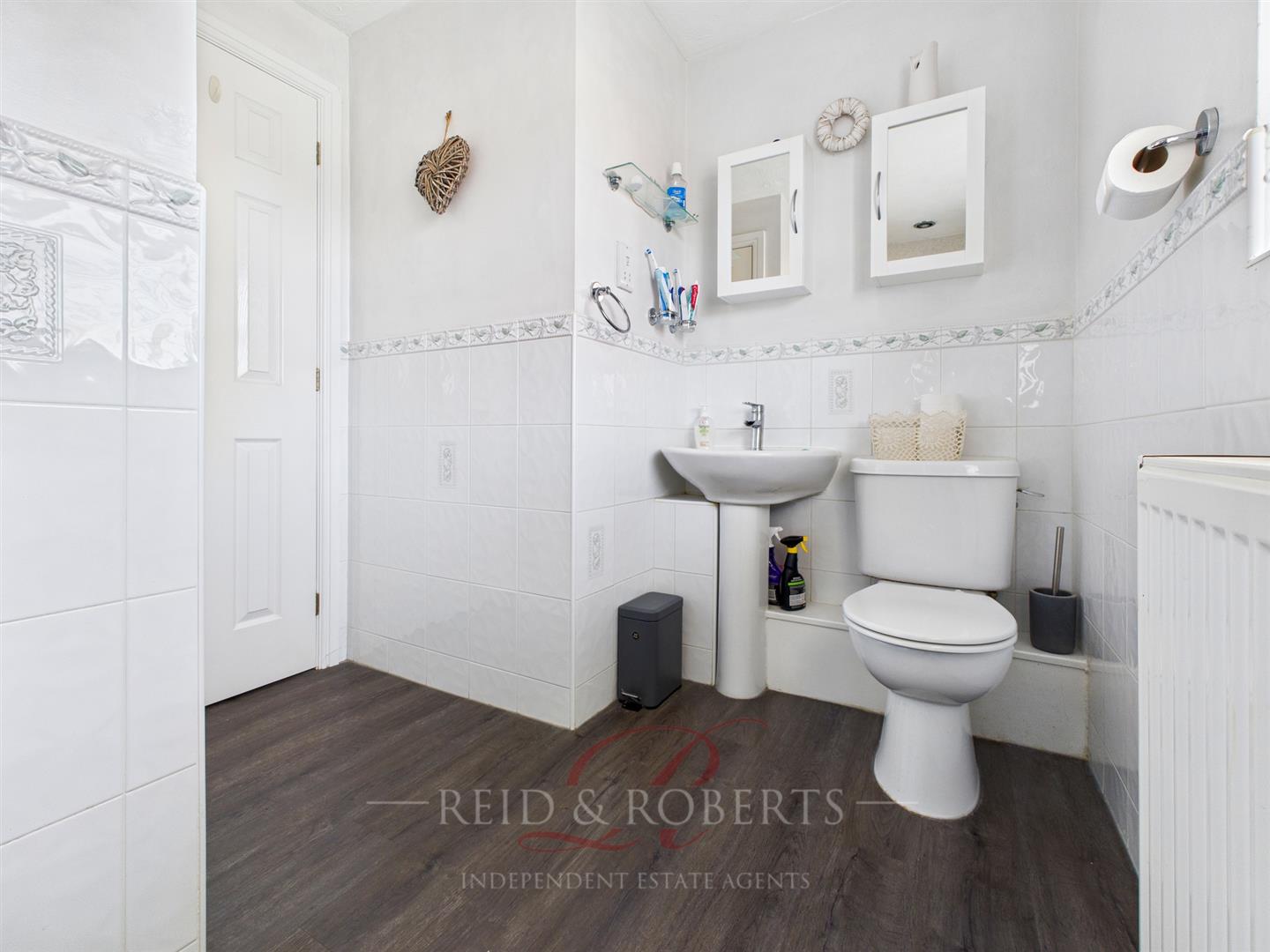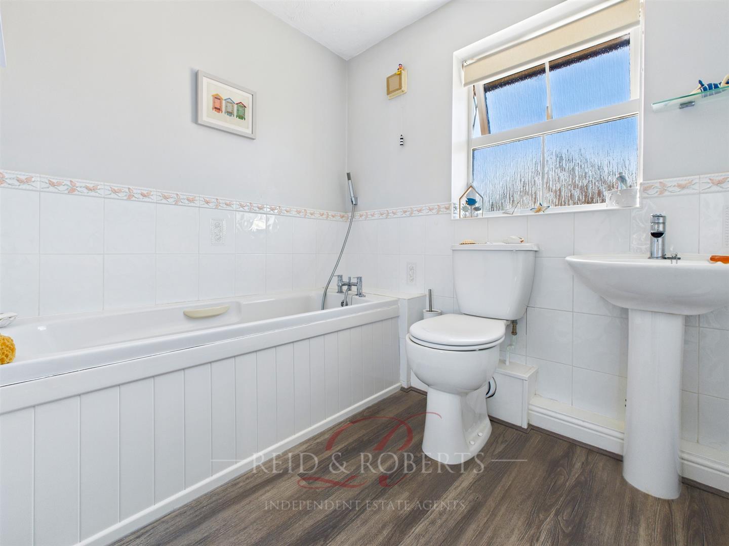 Fitted with a two piece white suite comprising low flush W.C. and wash hand basin with splashback tiling. Vertical radiator. Wood-effect flooring. UPVC double glazed window.