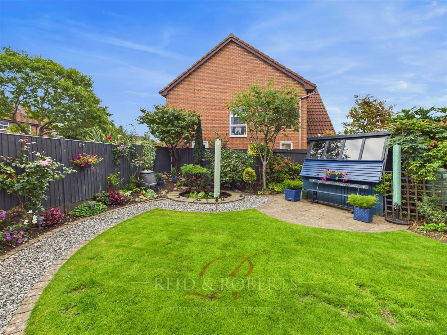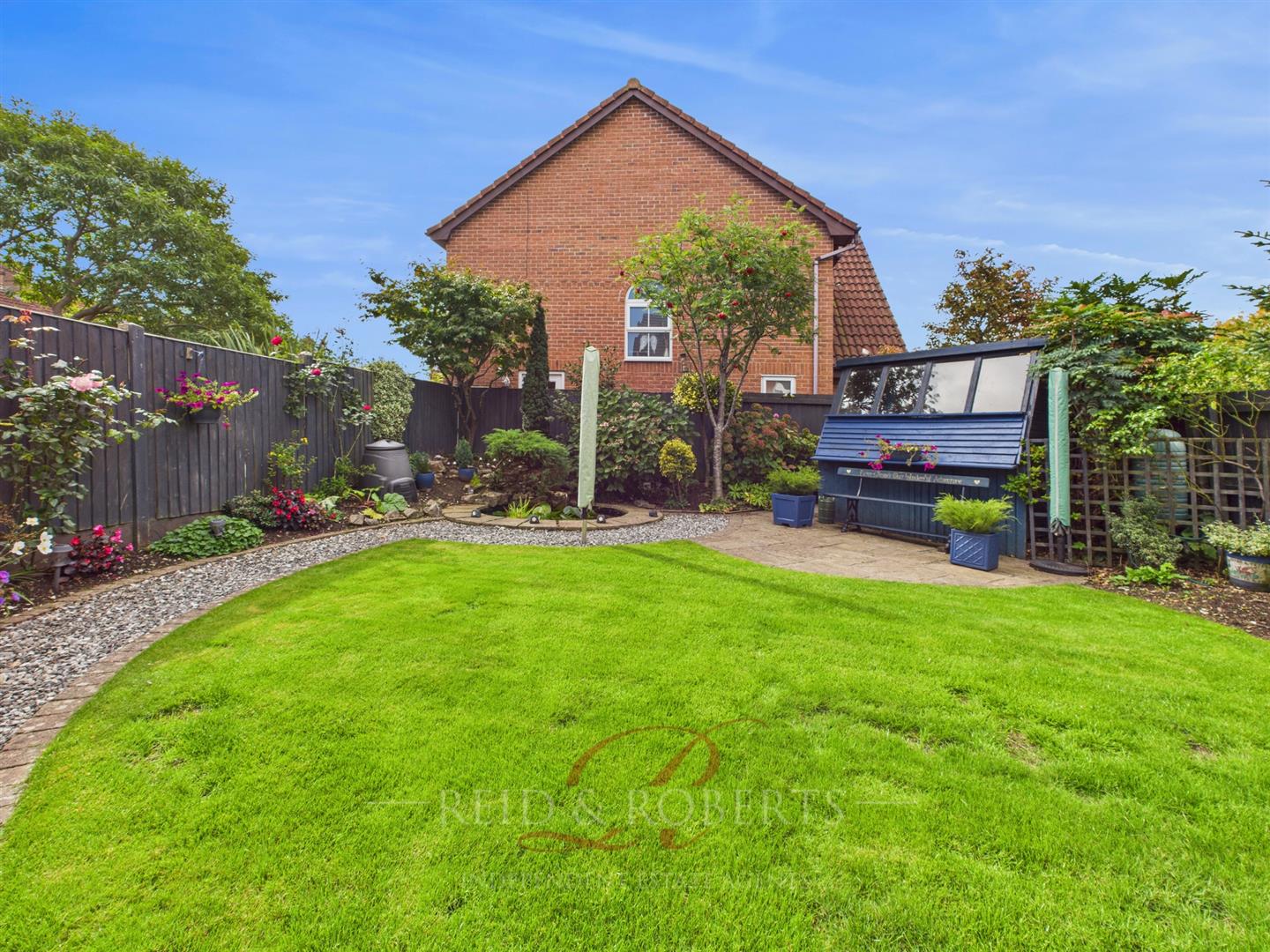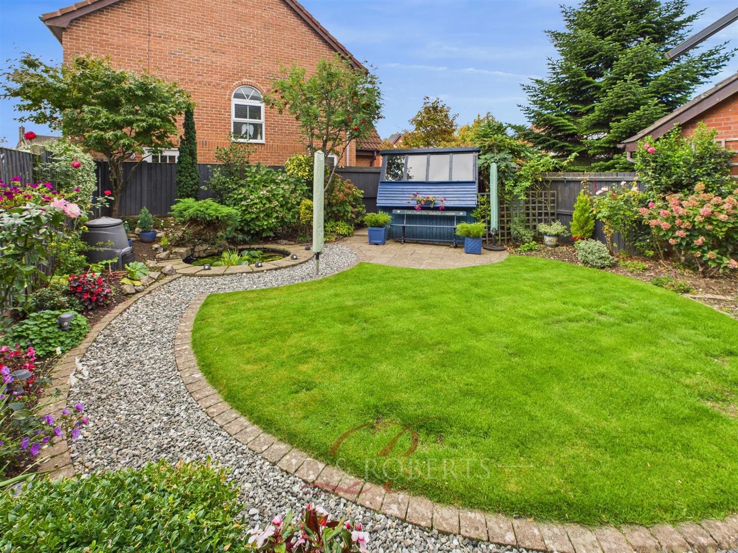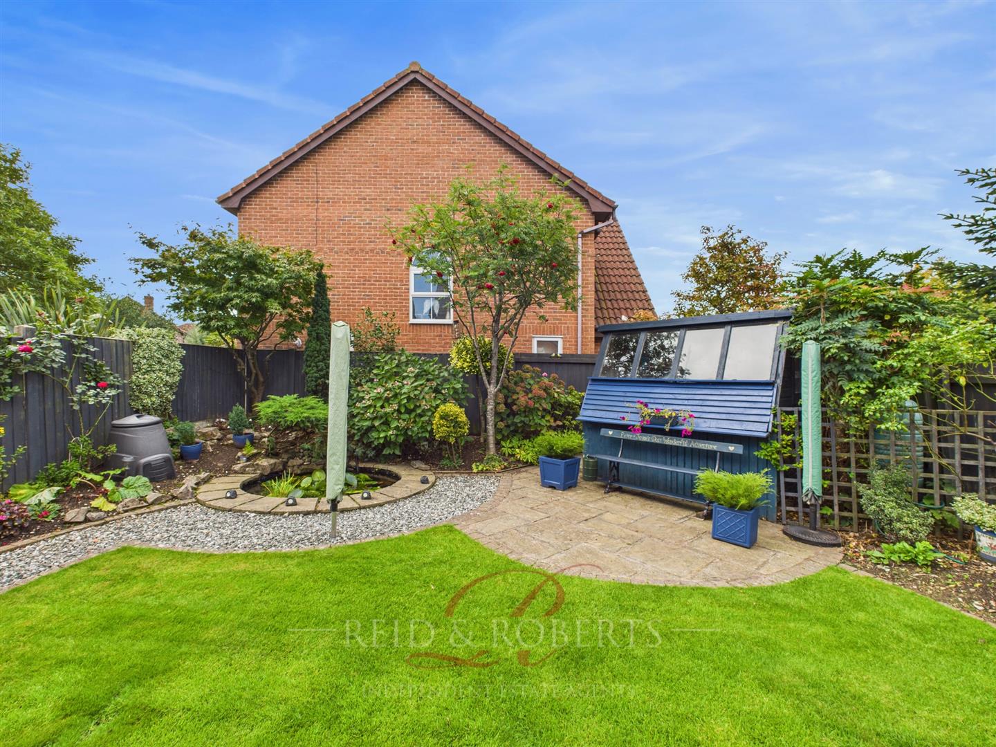 Gates to both sides give access to the rear garden which is beautifully landscaped, comprising a paved patio area, decked seating area, lawn, decorative chippings, well-stocked shrub and flower borders, and a feature pond. Outside garden store, power points, lighting, and cold water tap.