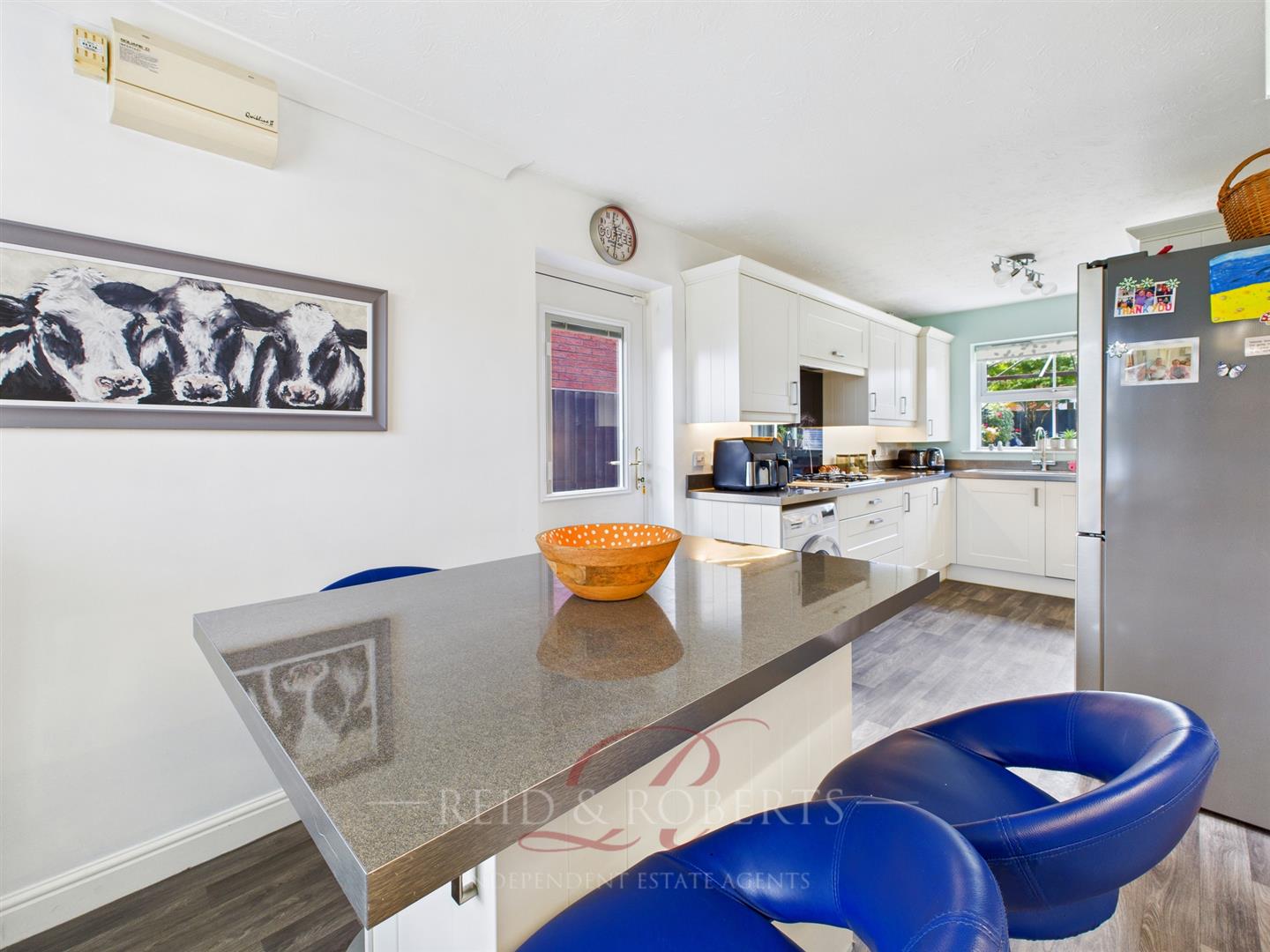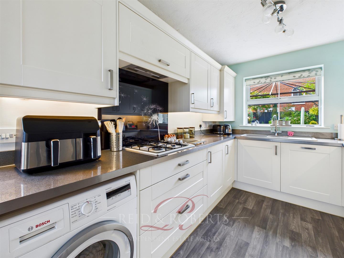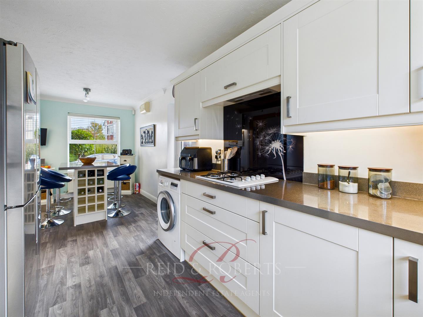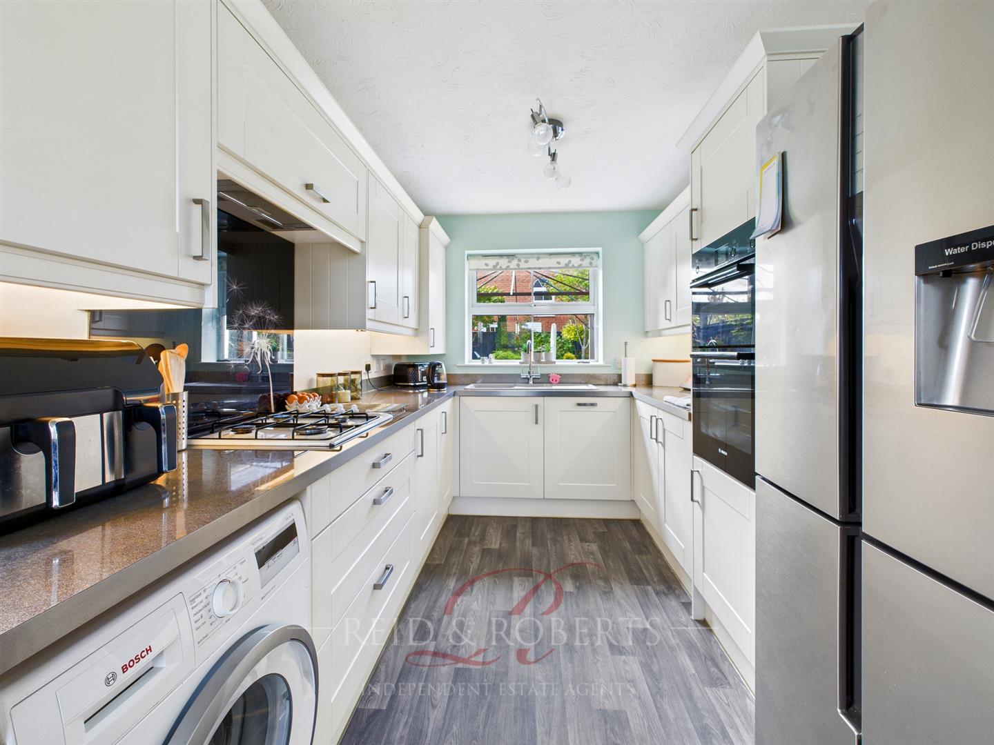 Fitted with a comprehensive range of modern wall and base units with complementary work surfaces and inset bowl and drainer with splashback tiling. Integrated appliances include hob with extractor above, double oven, and dishwasher. Fitted breakfast bar with bottle rack below and additional wall mounted storage lockers. Space and plumbing for washing machine and space for American-style fridge/freezer. Cupboard housing wall-mounted Worcester gas boiler. Wood-effect flooring. UPVC double glazed window to rear elevation and composite part glazed door to side