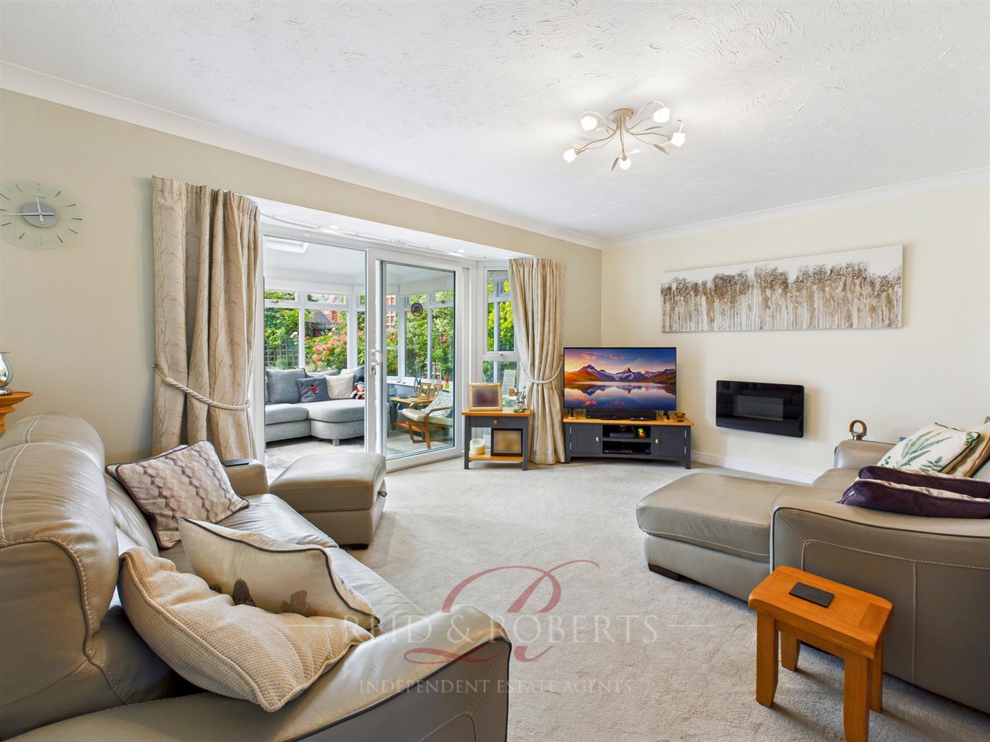 UPVC double glazed window. Panelled radiator. Coved ceiling. TV point. Wall-mounted electric fire. Patio doors leading to: