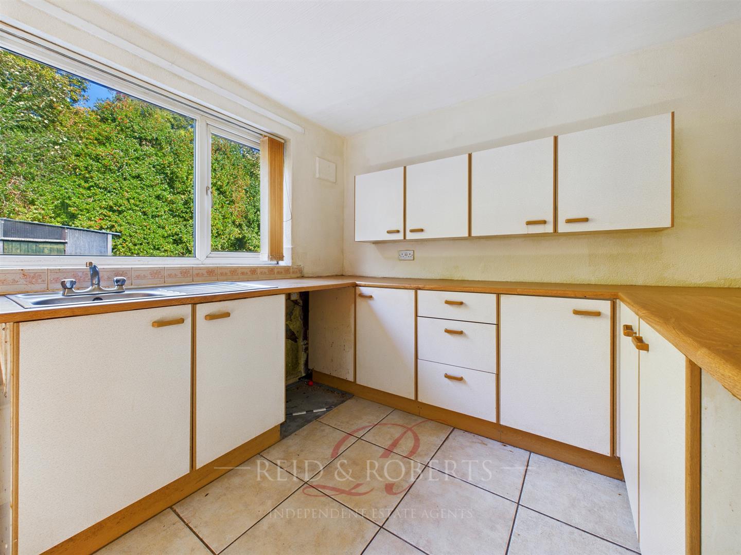 The kitchen is fitted with a range of wall and base units, a stainless-steel sink with drainer, and space for appliances including an oven, washing machine and fridge-freezer. A UPVC double glazed window overlooks the rear garden.