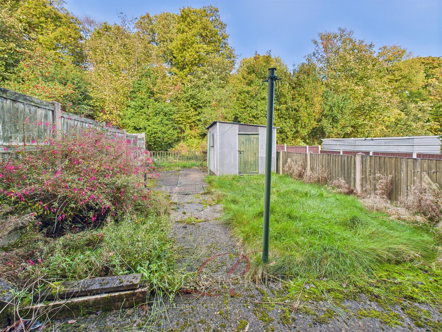 To the rear, the home enjoys a spacious and enclosed garden featuring a paved patio, lawned areas, and a pathway leading to the off-road parking. There is also a useful storage shed providing additional convenience. The garden is enclosed by wooden panel fencing with gated access to the parking area and offers a private, peaceful aspect, with mature trees beyond and no overlooking properties.