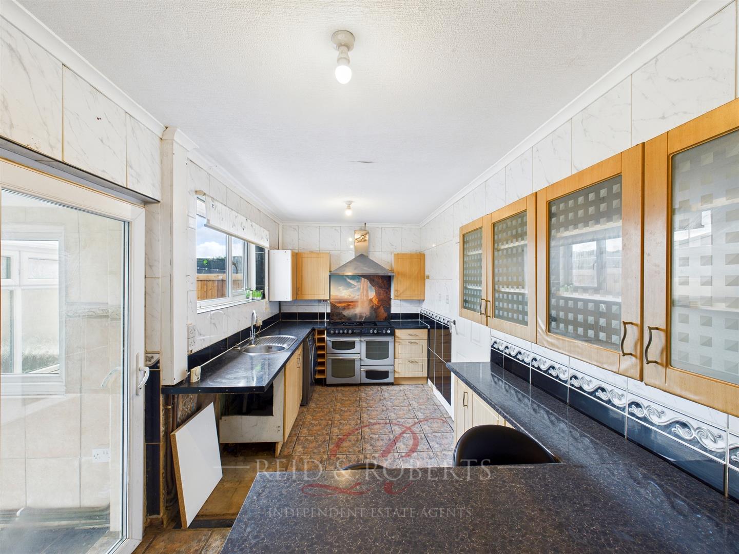 A spacious and well presented kitchen fitted with a range of wall and base units, including glass fronted display cabinets, and a breakfast bar style island. Finished with marble effect tiled walls and a tiled stone floor, the kitchen offers a stylish and practical space. It includes a five ring induction hob with extractor fan, double oven and separate grill, stainless steel one and a half bowl sink with mixer tap and drainer, and plumbing for a washing machine. A UPVC window overlooks the rear garden, while a UPVC glazed door leads through to the utility room.