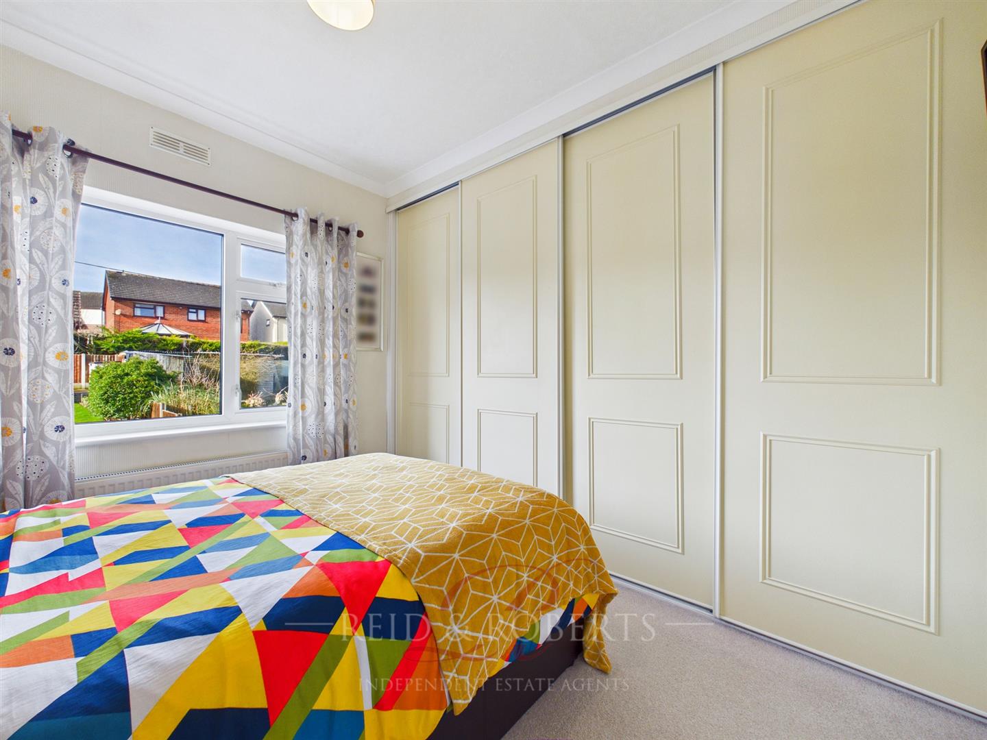 Situated at the rear of the property, a large UPVC double-glazed window attractively overlooks the garden. The room provides fitted sliding wardrobes with ample hanging and shelving space, practical for organisational solutions. Features of the space include a ceiling light, panelled radiator and power points.