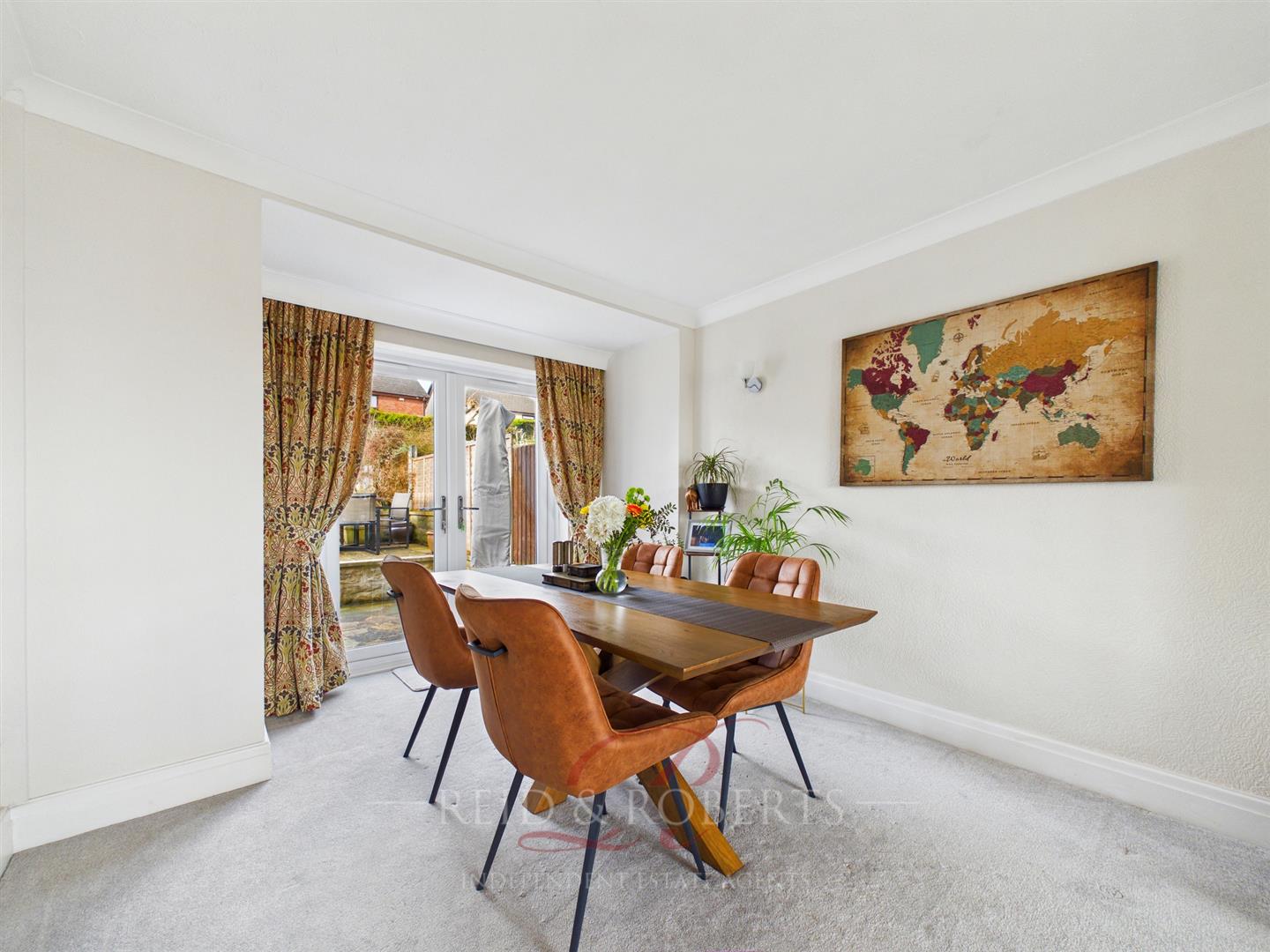 Opening into the dining area, the space is well-lit with a ceiling and wall lights, making it perfectly suited for everyday living and entertaining guests. UPVC double-glazed French doors provide access onto the rear patio, creating a seamless indoor outdoor flow. The space includes power points and a panelled radiator.