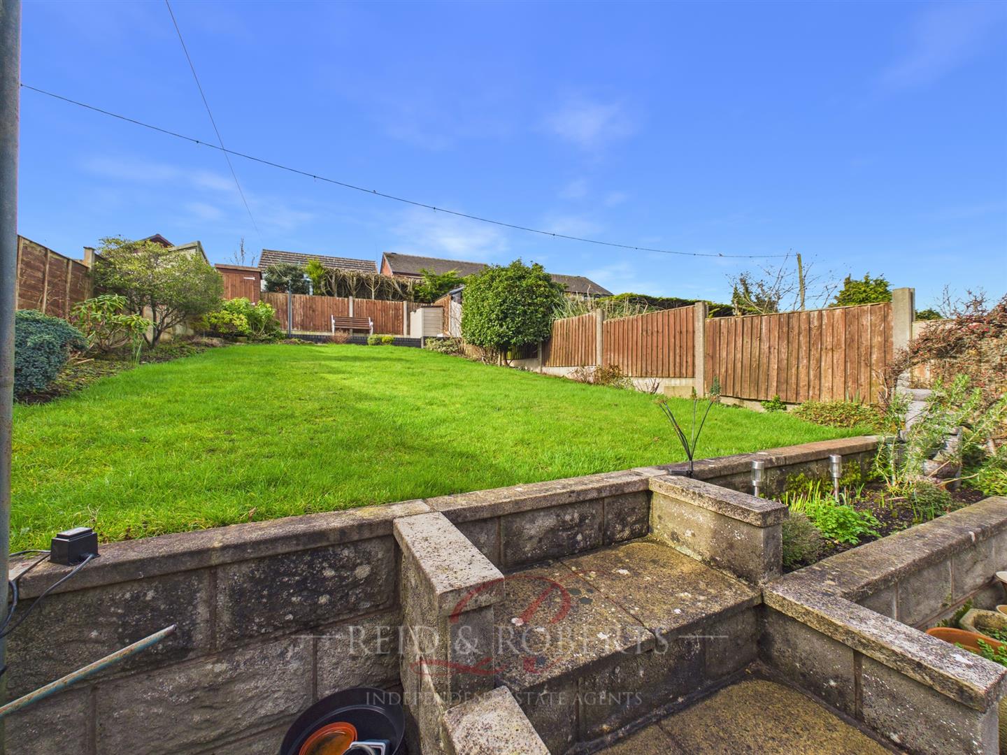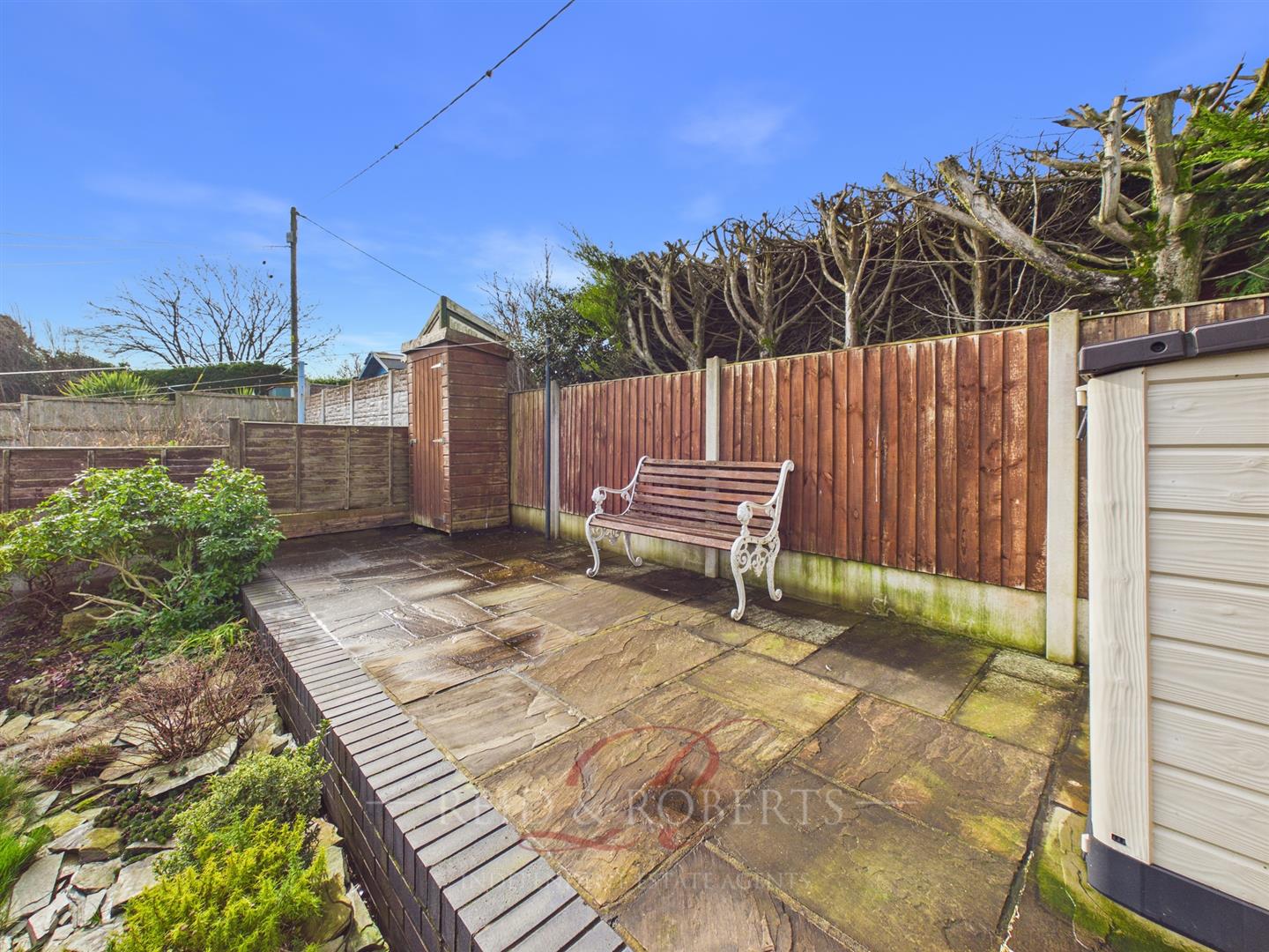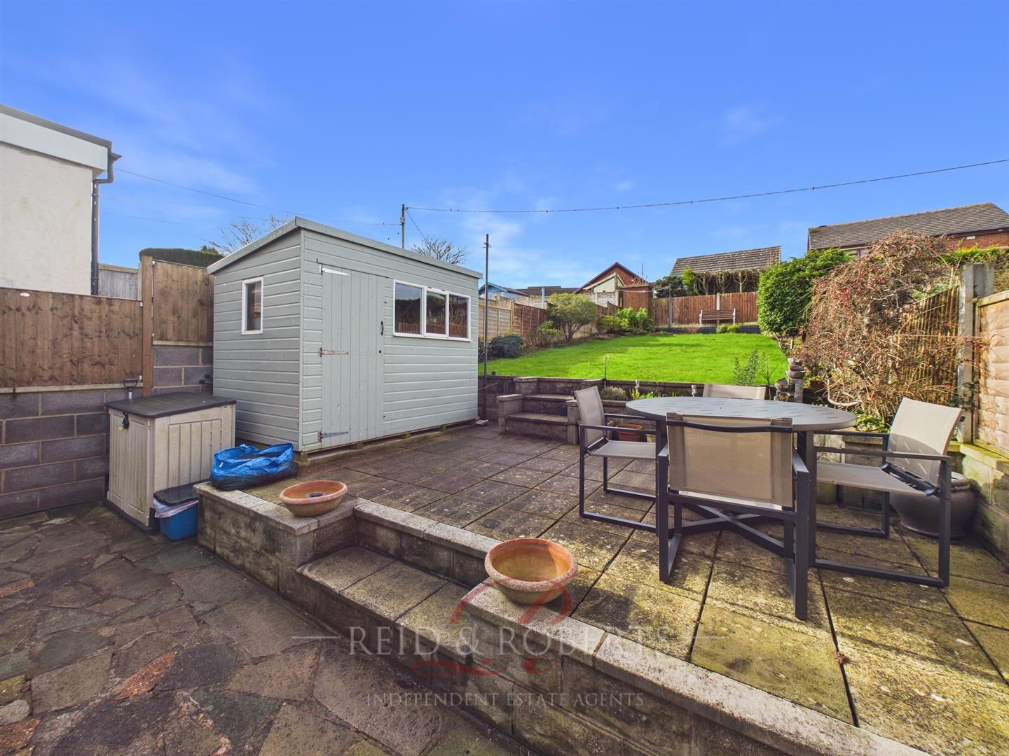 The rear garden has been thoughtfully landscaped to create a versatile and inviting outdoor space. Tiered paved patio areas are ideal for outdoor dining and entertaining, with space for a shed, that provides additional practical storage for garden furniture or tools. Steps lead up to the well-maintained lawn area that is bordered by timber fencing, established shrubs and mature planting, offering a good degree of privacy. With further steps to the back of the plot offering an extra patio area to enjoy the warmer seasons.