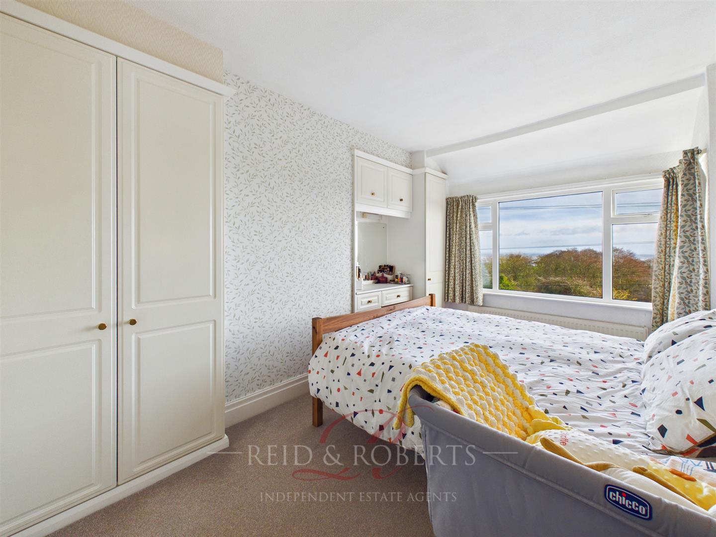 This bright and well-presented main bedroom offers a calm and comfortable retreat, arranged to maximise both space and natural light. A large UPVC double-glazed bay window to the front elevation frames views of countryside and the Dee Estuary, and allows daylight to pour into the room.