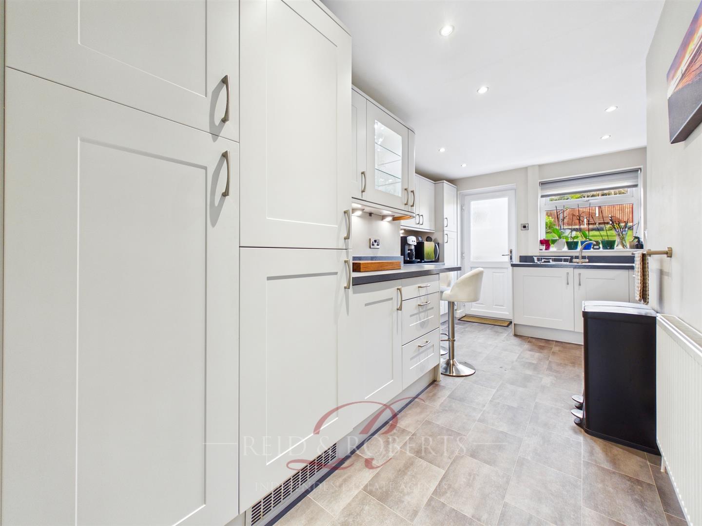 Finishes include spotlights, a panelled radiator, vinyl flooring, power points and ample storage solutions. A UPVC door with a double-glazed frosted glass inset provides access to the rear garden.