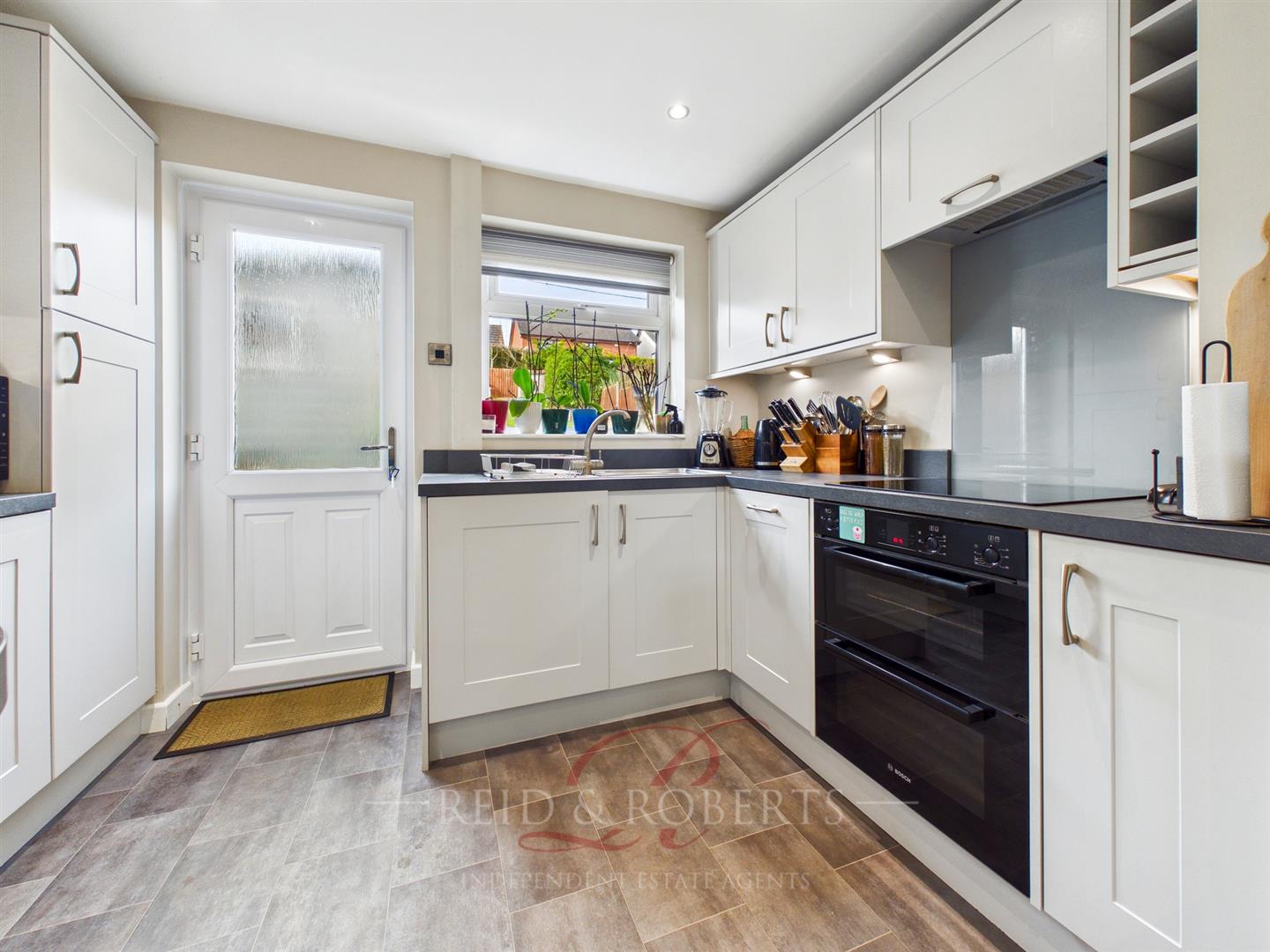 Fitted with a range of modern wall, drawer and base units with a complimentary worktop and breakfast bar area, the space is well-appointed with integrated appliances including a fridge freezer, slimline dishwasher, washing machine and double oven. A four-ring induction hob with a tiled splashback and extractor hood above and a stainless steel sink with drainer and swan neck mixer tap that sits beneath a UPVC double-glazed window peacefully overlooking the rear garden, complete the room.