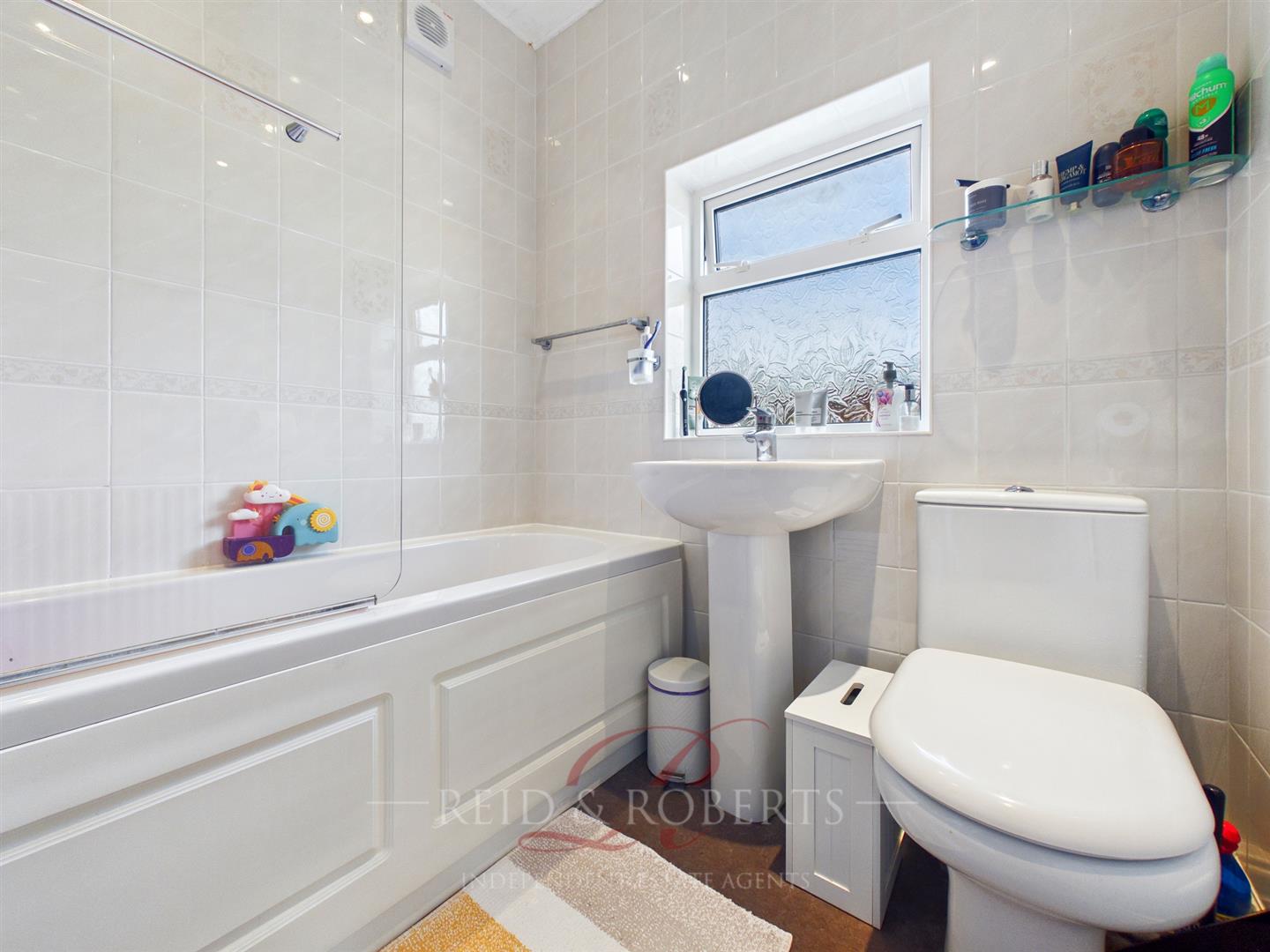 The family bathroom is fitted with a three-piece suite comprising a pedestal sink with taps over, W.C and a panelled bath with taps and an electric shower, adjustable handset attachment and shower screen. Fully tiled walls and vinyl flooring allow for easy maintenance, whilst a panelled radiator, ceiling light, extractor fan and a UPVC double-glazed frosted window to the rear elevation complete the room.
