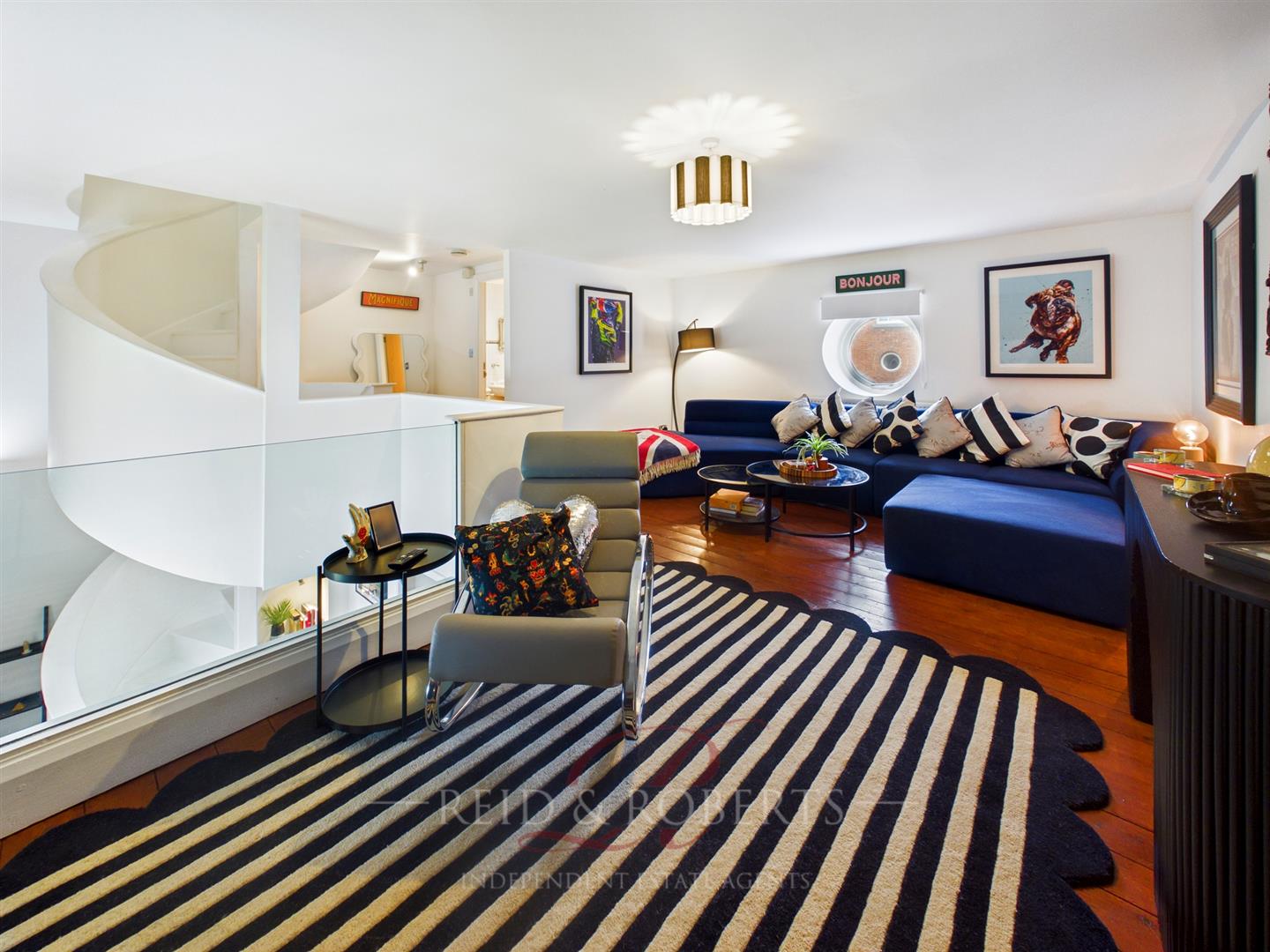 An impressive and spacious mezzanine lounge, tastefully decorated and full of character, including attractive flooring and a distinctive porthole double glazed window. The room benefits from a balustrade balcony overlooking the properties grand ground floor and the large window that pictures views across the estate grounds. The room is furnished with a large sofa, creating a comfortable yet elegant living space.