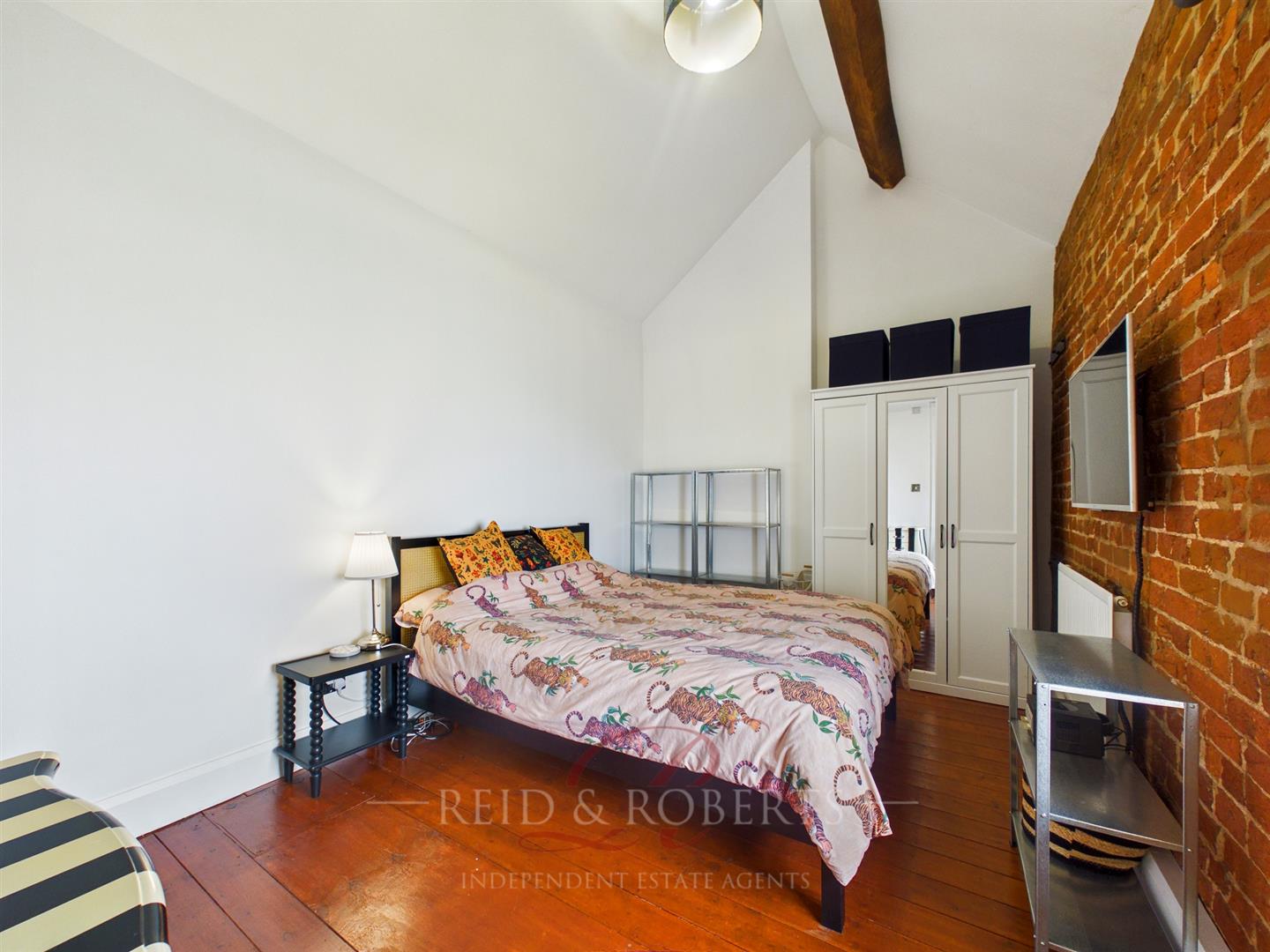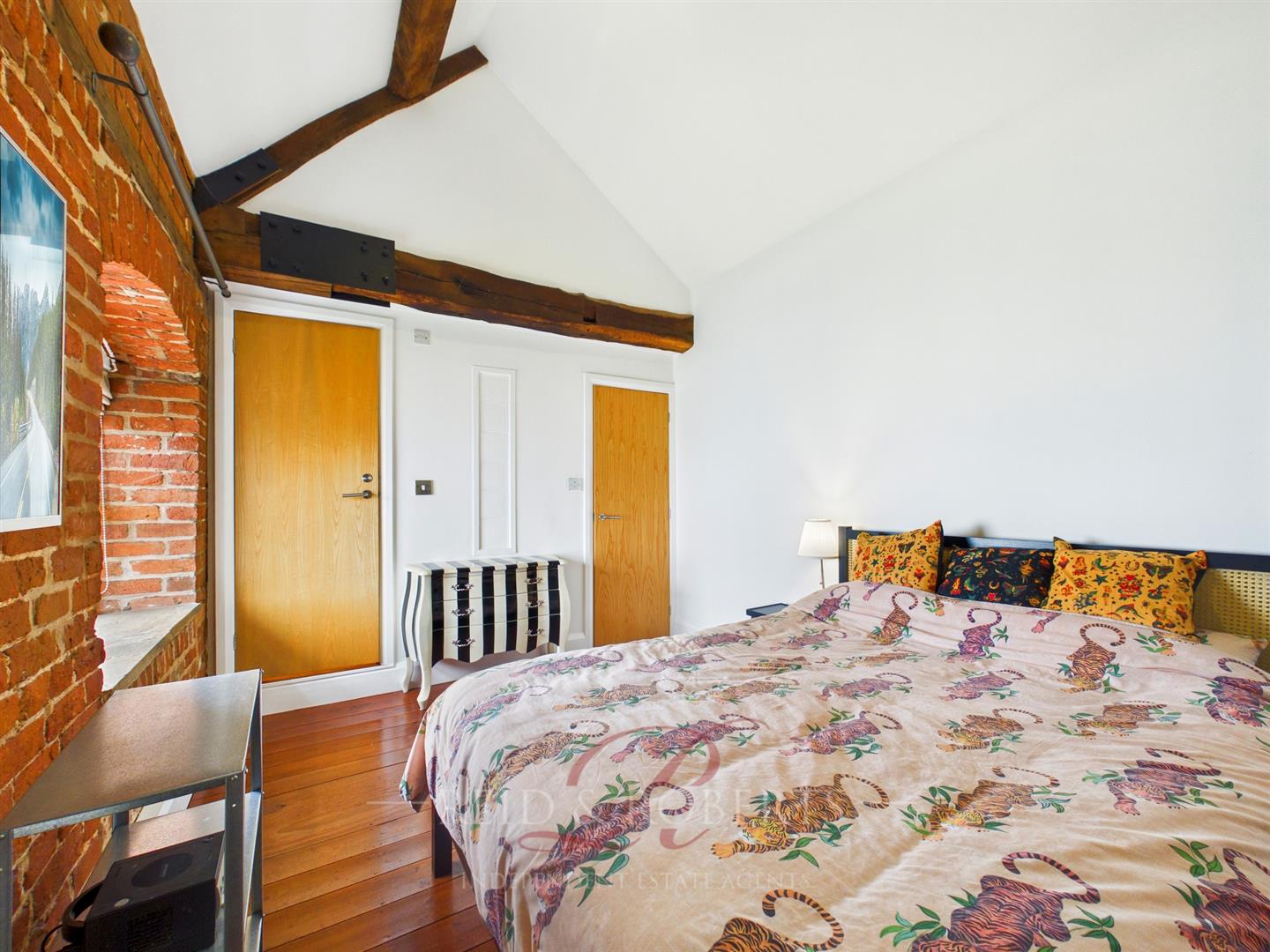 A striking main bedroom with high ceilings, exposed beams and feature brickwork, offering a wealth of character. A window provides attractive views across the estate. The room further benefits from an en-suite with shower cubicle, low flush W.C and basin.