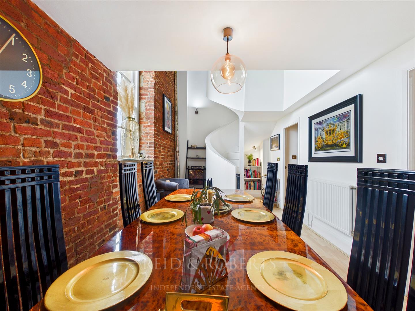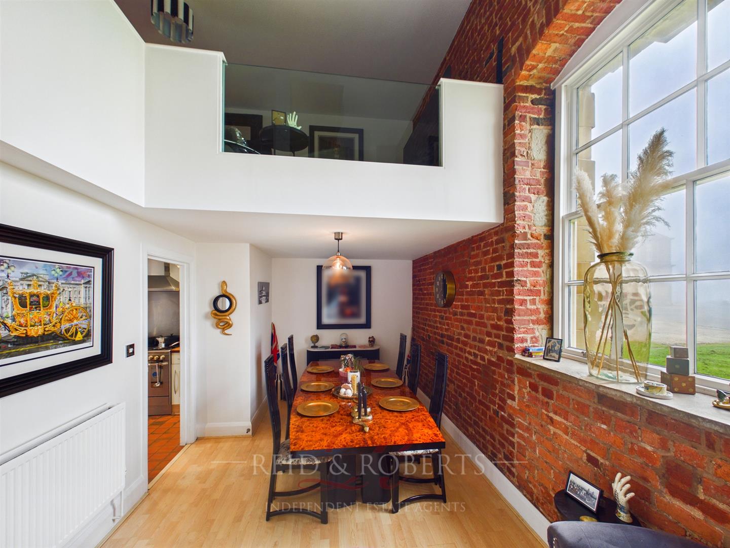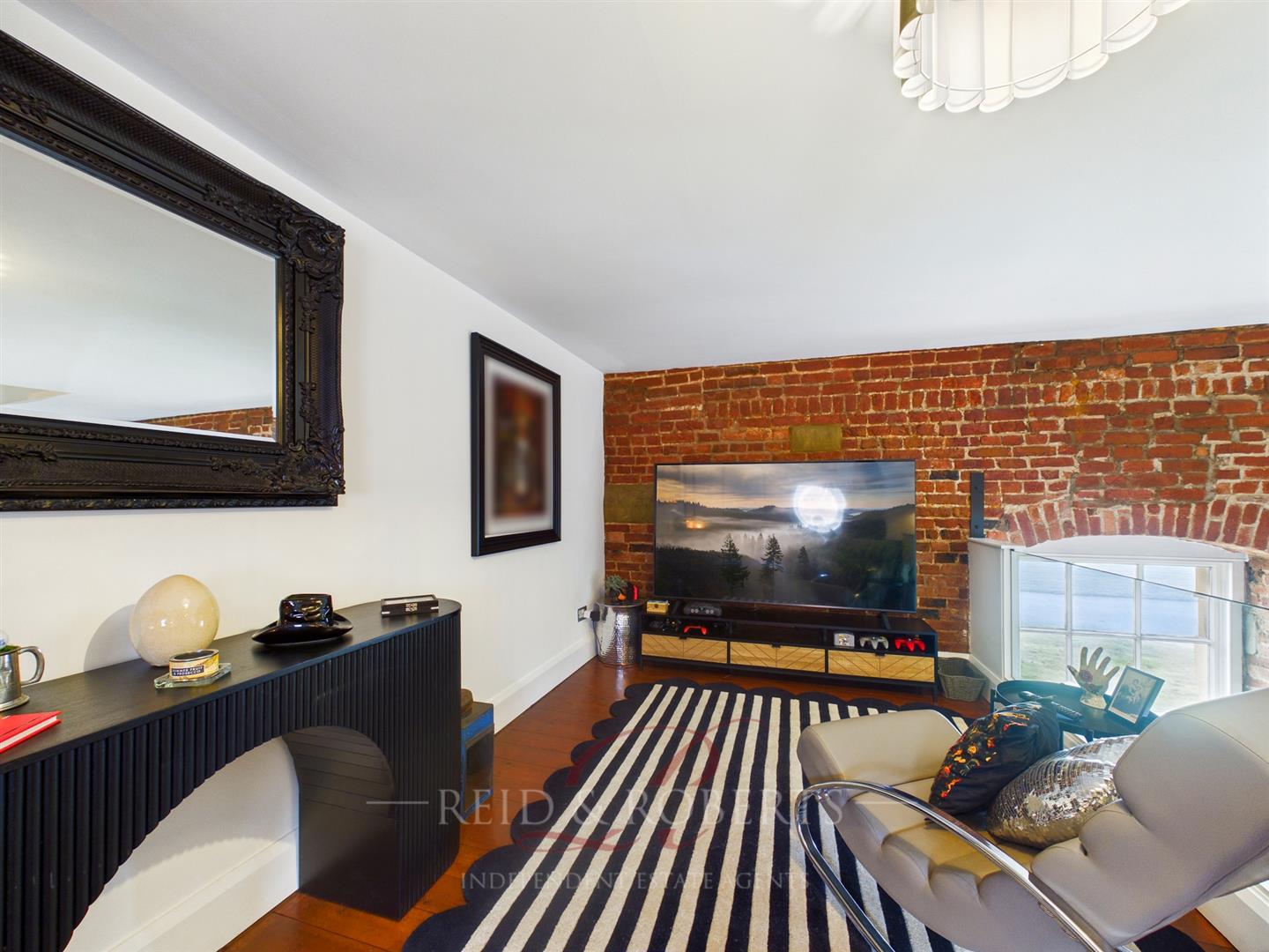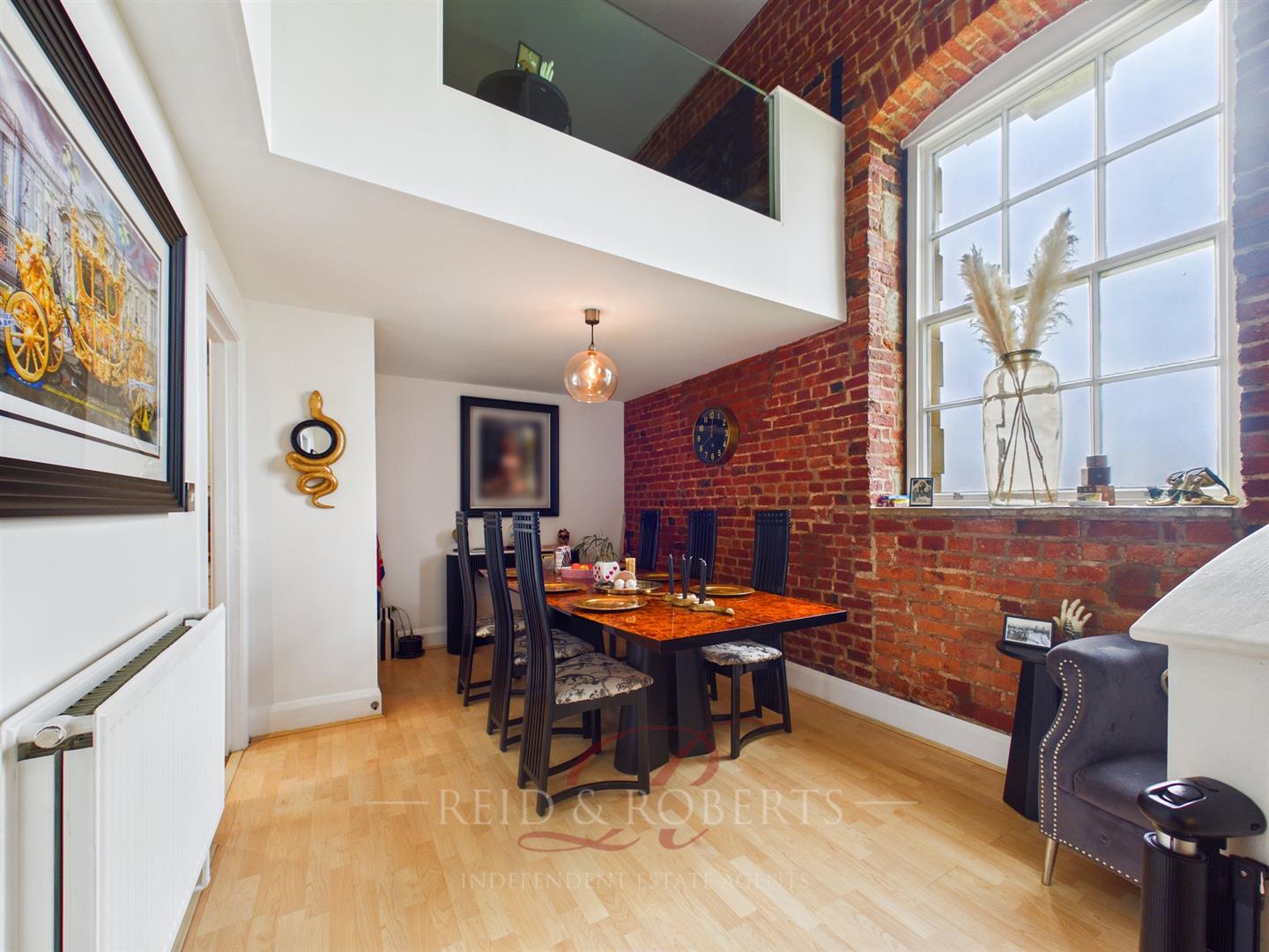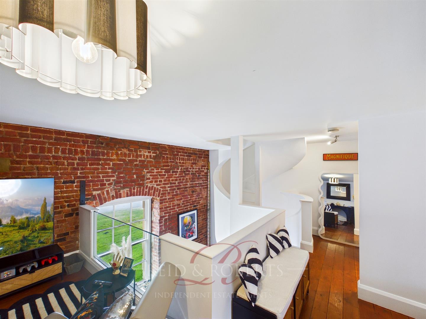 The accommodation briefly comprises an entrance hallway with cloakroom/WC, leading to a stylish dining room with dining table and adjoining snug, a well appointed kitchen with gas range cooker, double oven and white goods. To the first floor is a spacious and elegantly presented lounge with feature window and balustrade balcony overlooking the grand interior, together with a modern family bathroom comprising of a three piece suite. The second floor offers three bedrooms, including a principal bedroom with exposed beams, feature brickwork, views over the grounds and en-suite, a further double bedroom, and a single bedroom/study.
