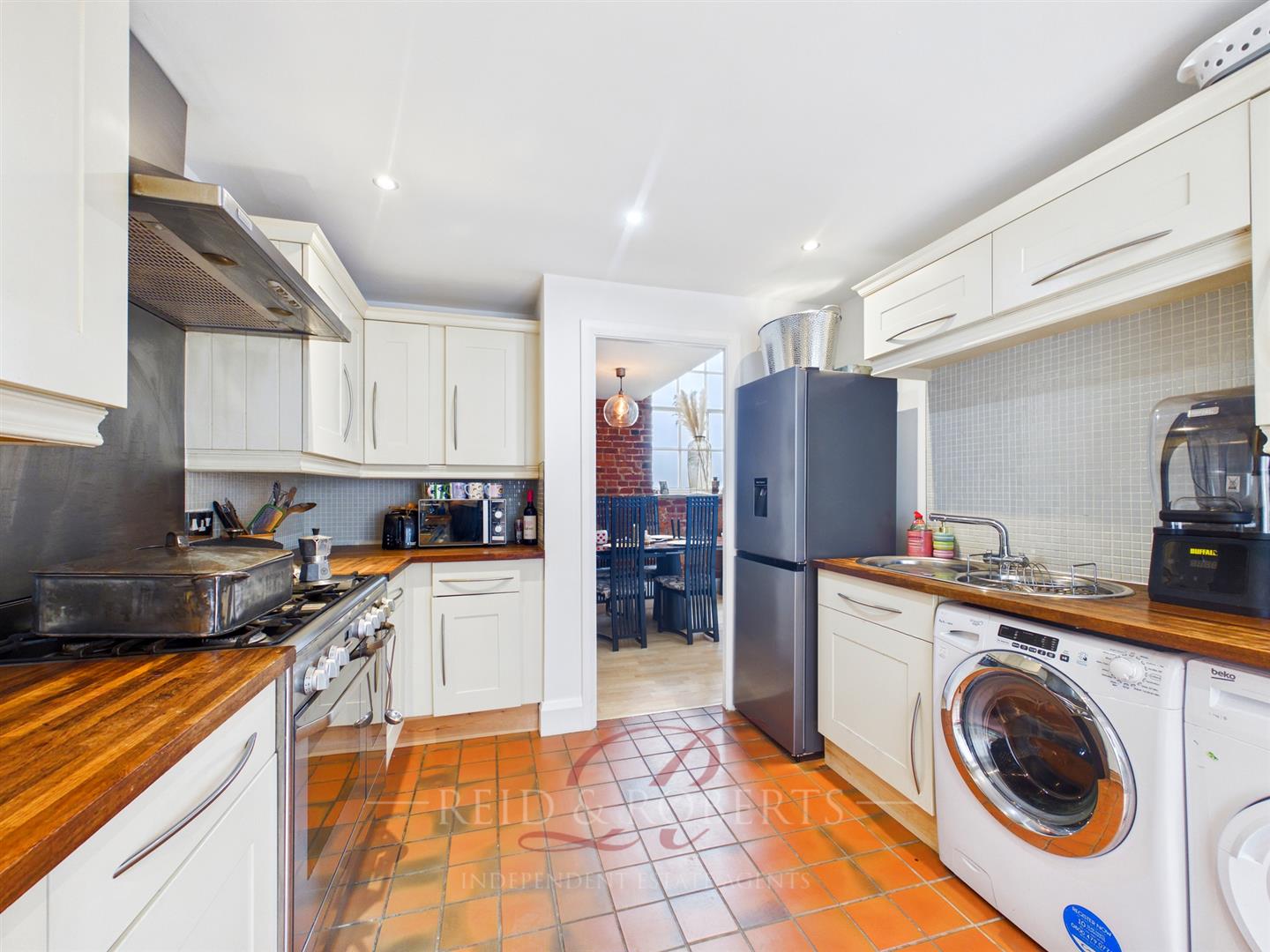A well appointed kitchen fitted with a substantial gas range cooker with double oven, along with a range of white goods. The kitchen offers ample storage and preparation space and is finished to a high standard.