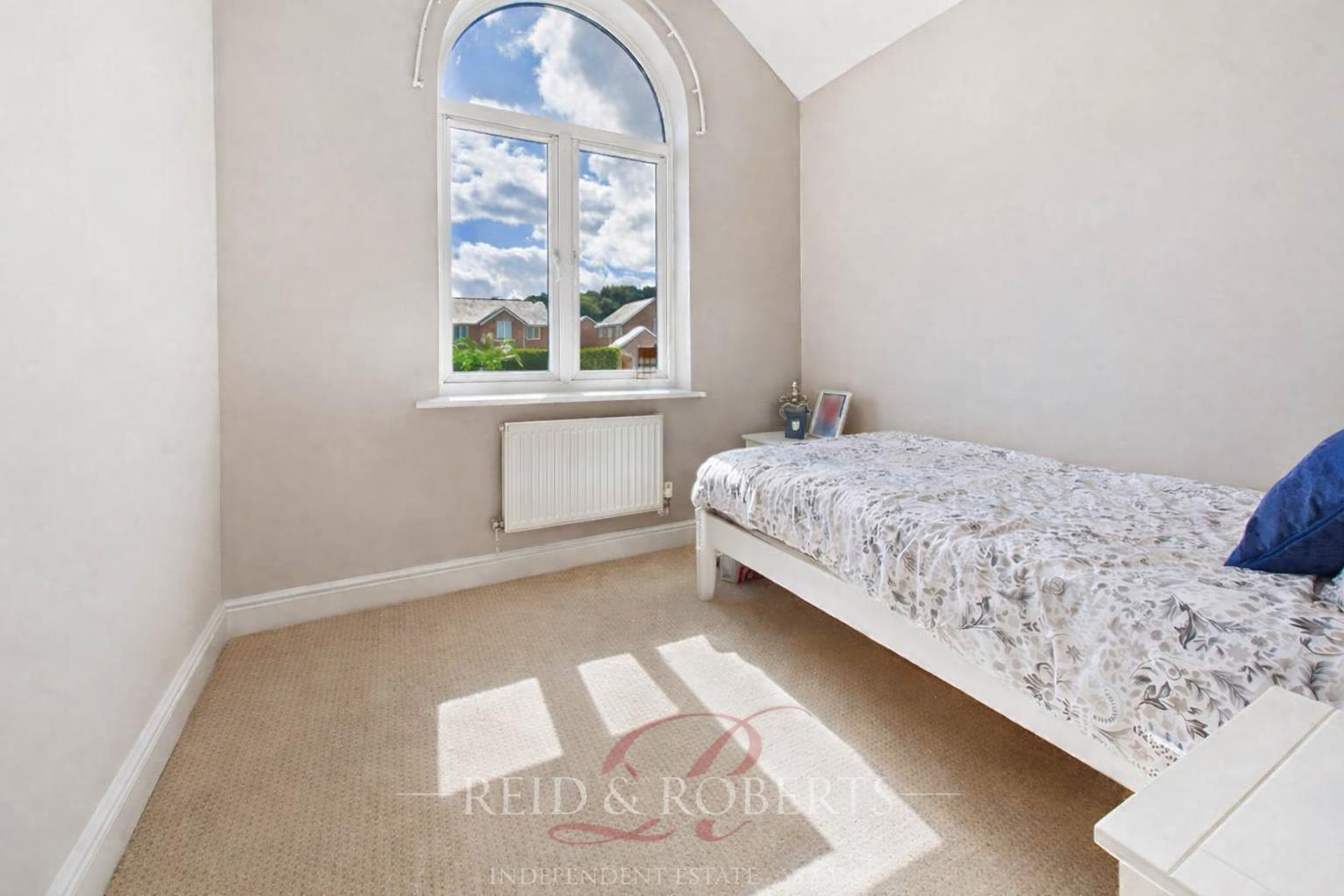 The main focal point of the space is the gorgeous UPVC double-glazed arch window to the front elevation which floods the space with natural light. Offering versatility, the space currently accommodates a bed with side table and office desk. Features include power points, a ceiling light alongside spotlights and radiator.